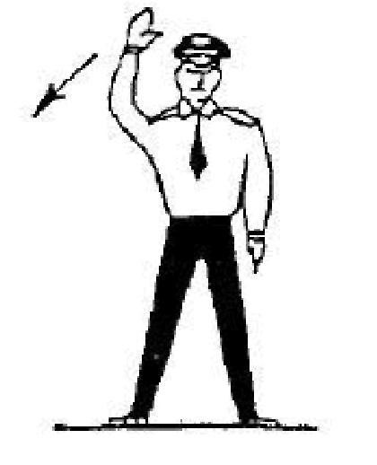 2. «ВОЗЬМИТЕ ВПРАВО» (по ходу движения) - левая рука вытянута горизонтально в сторону ладонью вниз, правая рука поднята и двигается вперед-назад. |