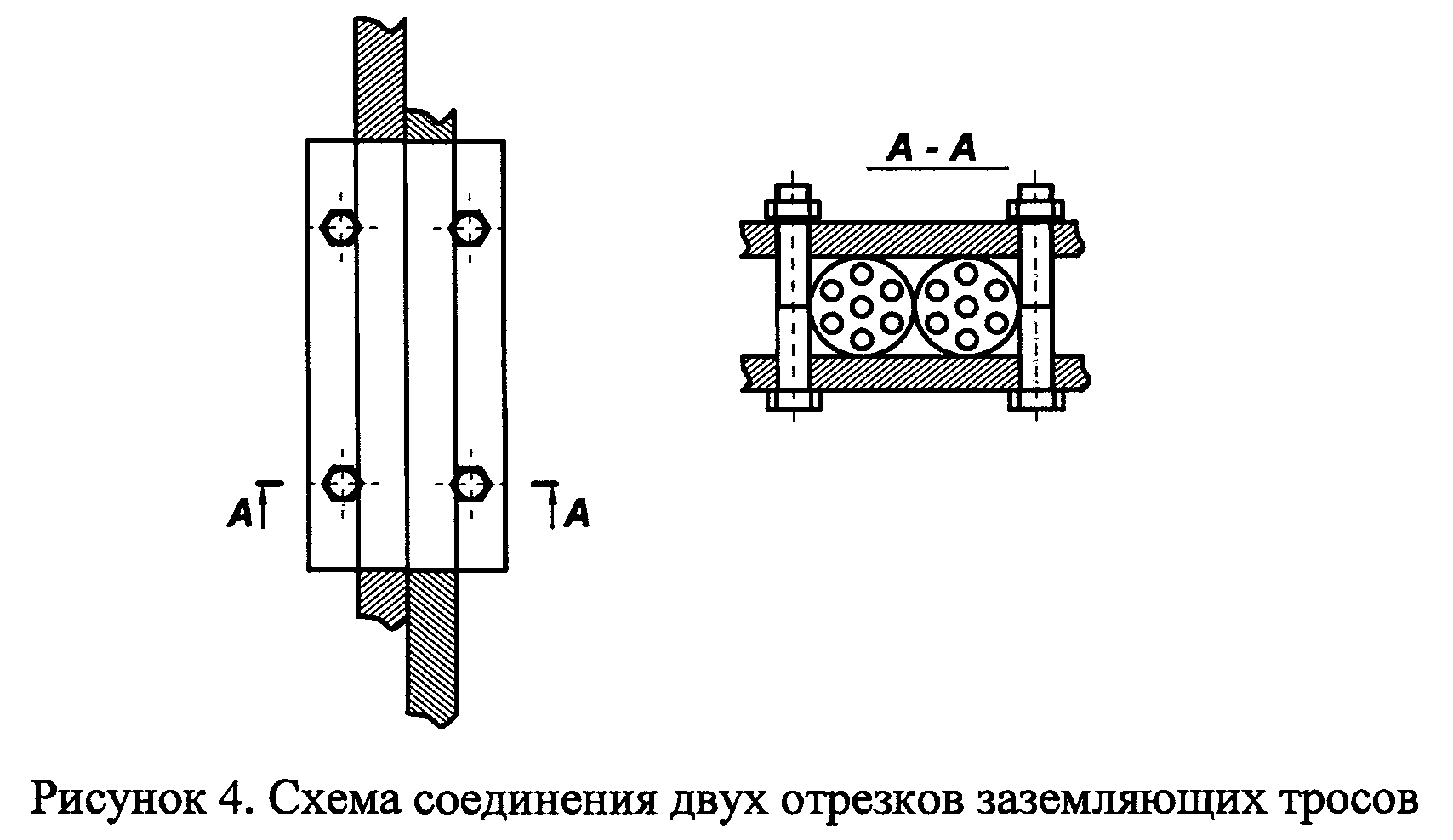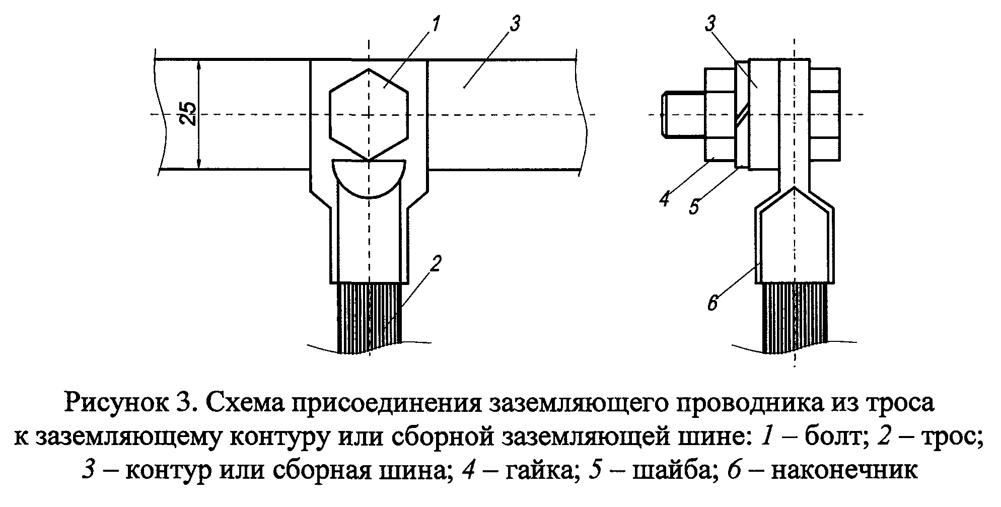 65. Присоединение заземляющих проводников к заземляющей шине осуществляется сваркой (если позволяют условия) или с помощью болтового соединения (рисунки 2 и 3), или другими равноценными способами. Пример соединения двух отрезков заземляющих тросов показан на рисунке 4.