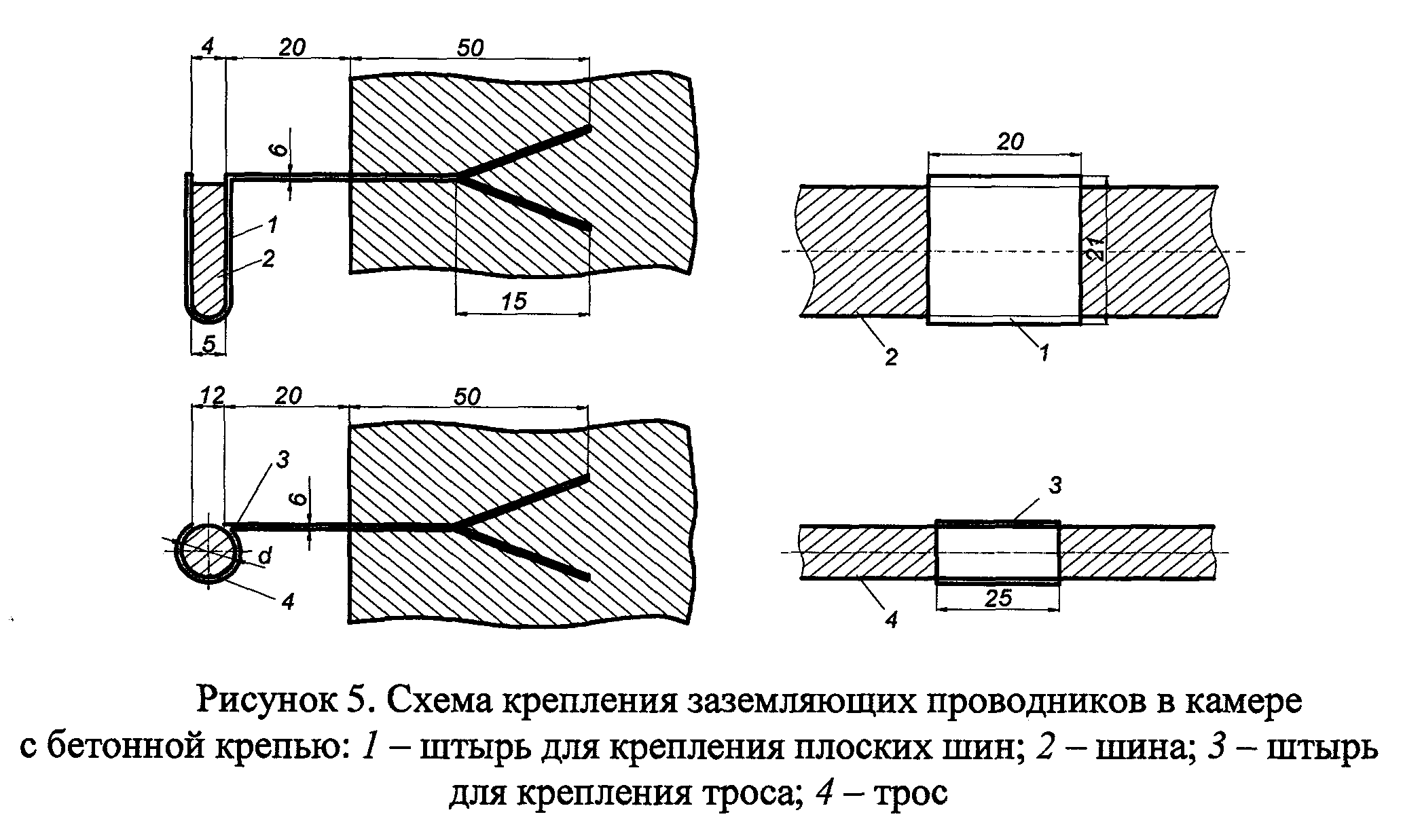 66. В машинных камерах и прочих выработках с бетонной крепью заземляющие контуры и проводники поддерживаются специальными штырями или скобами (рисунок 5).