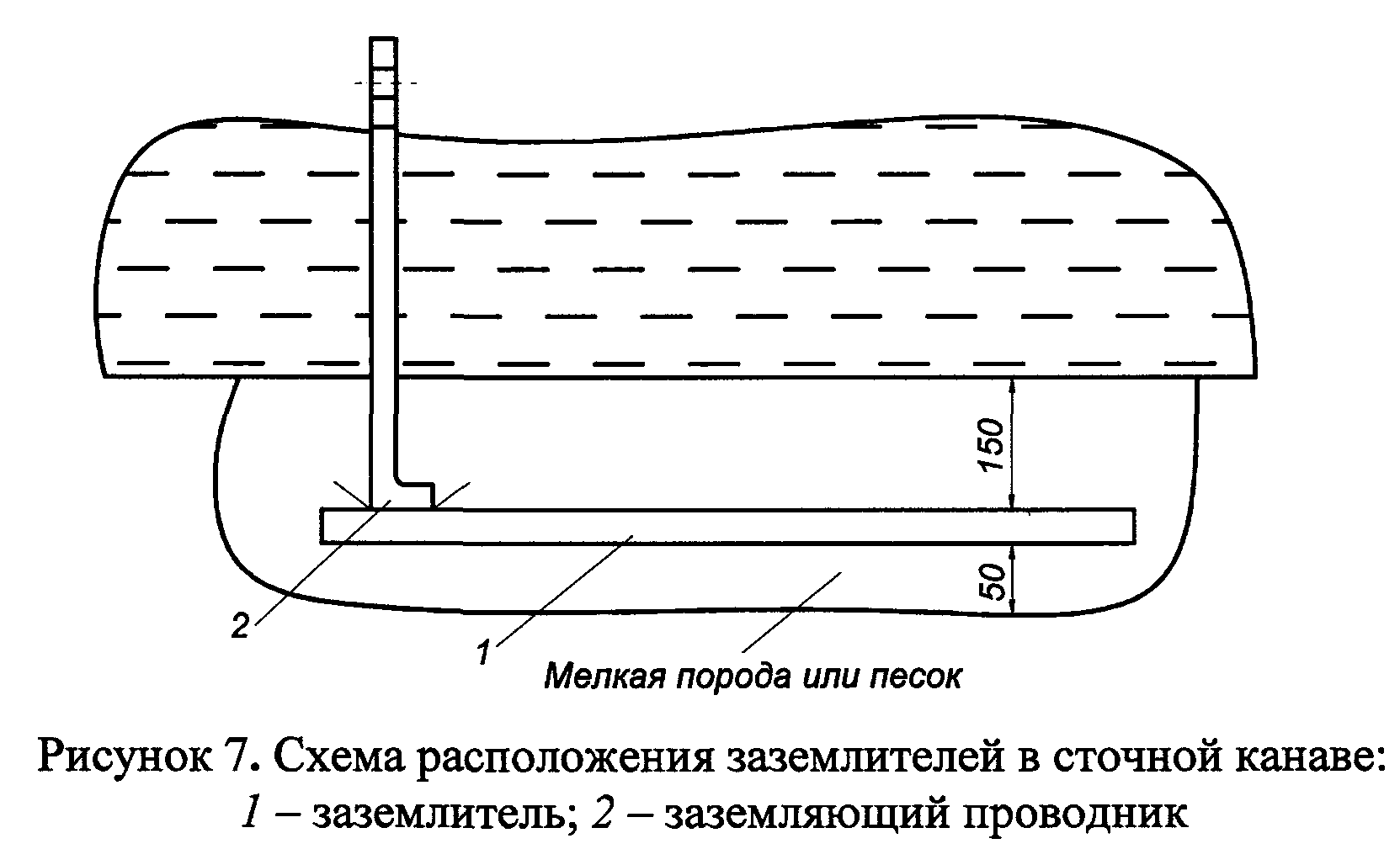 69. Заземлитель укладывают в горизонтальном положении в углубленном месте сточной канавы на "подушку" толщиной не менее 50 мм из песка или мелких кусков породы и сверху засыпают слоем в 150 мм из такого же материала (рисунок 7).