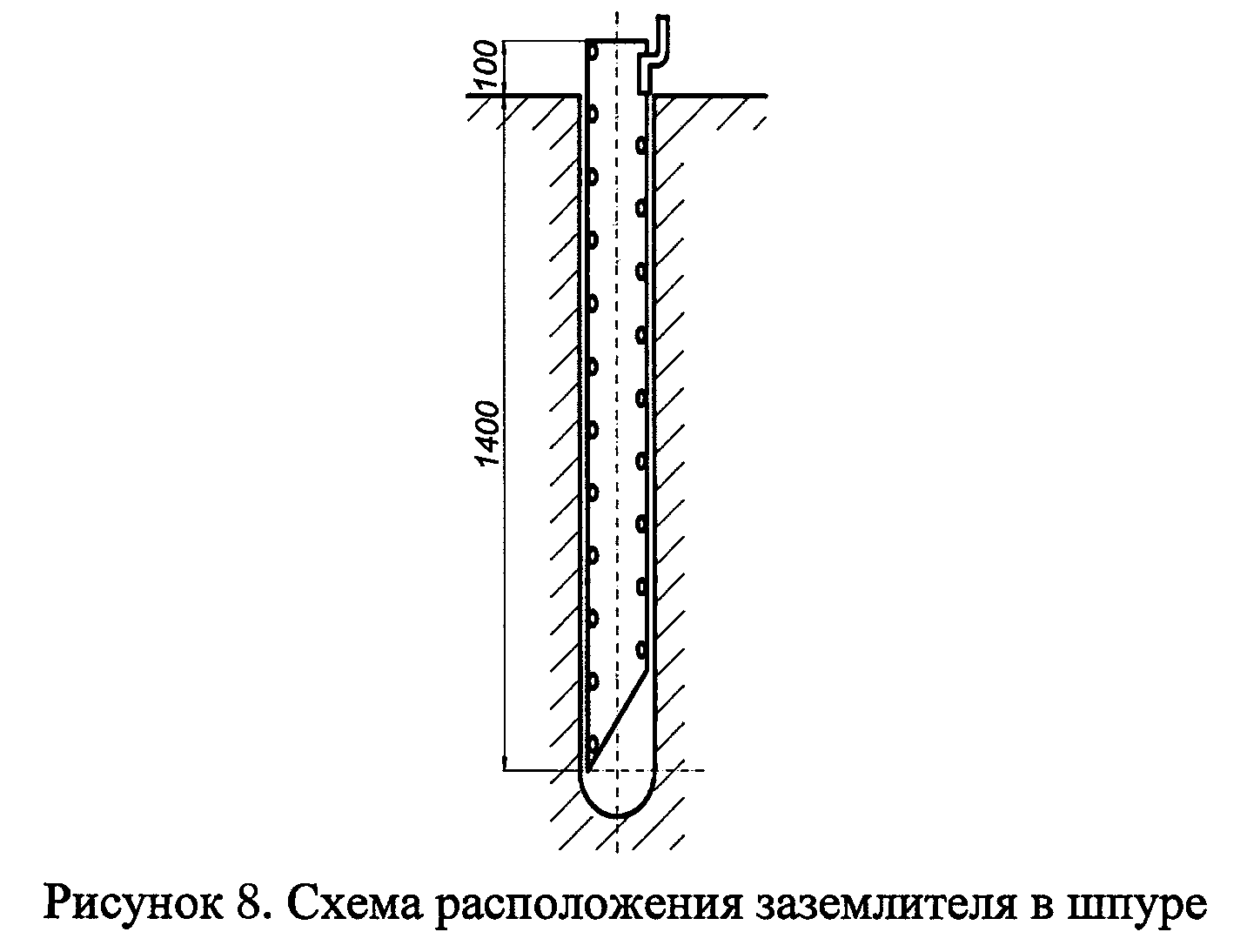 Трубу помещают в шпур, пробуренный вертикально или под углом до 30° от вертикальной оси на глубину не менее 1,4 м (рисунок 8).