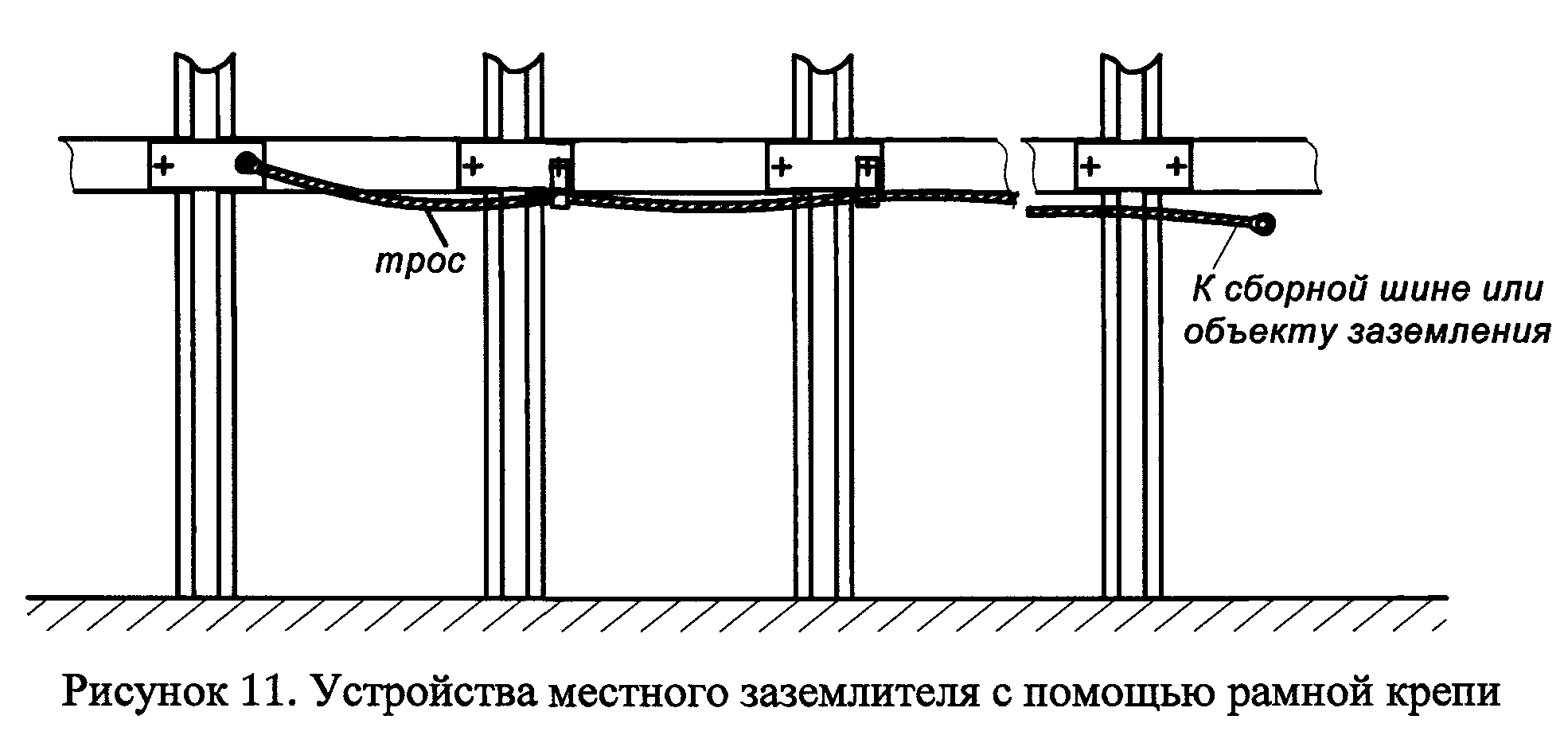 Используемая для этой цели рамная крепь имеет не менее 3-х секций. Заземляющий проводник присоединяют с помощью дополнительной гайки к скобе, закрепляющей звенья рамной металлокрепи (рисунок 10).