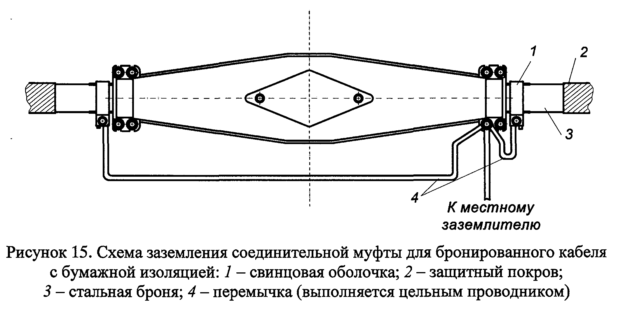 Присоединение заземляющего проводника к соединительной муфте и к оболочкам соединяемых муфтой кабелей показано на рисунке 15.