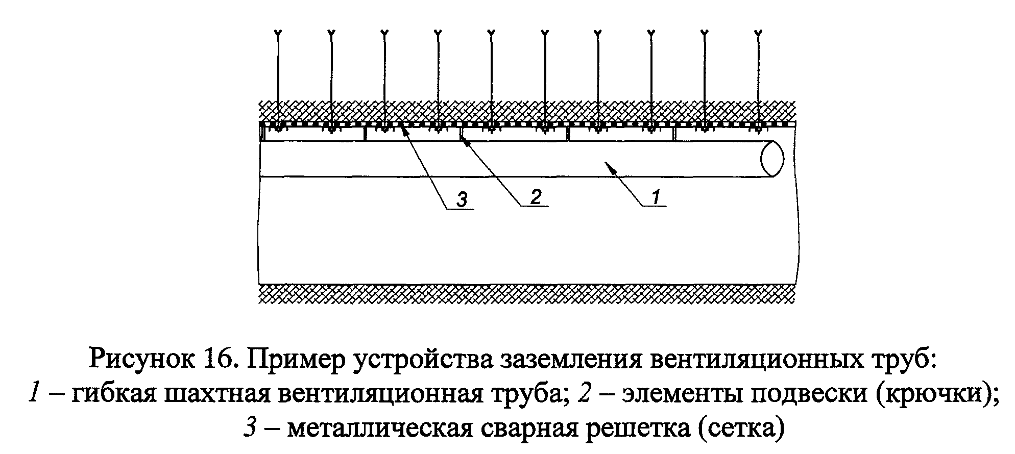 79. Заземление металлических элементов гибких вентиляционных труб, датчиков расхода воздуха и других объектов, на которых происходит накопление статического электричества, осуществляют подвешиванием этих элементов к стальной затяжке из сварной решетки или сетки с помощью крючков (петель, колец) из проволоки диаметром не менее 5 мм (рисунок 16).