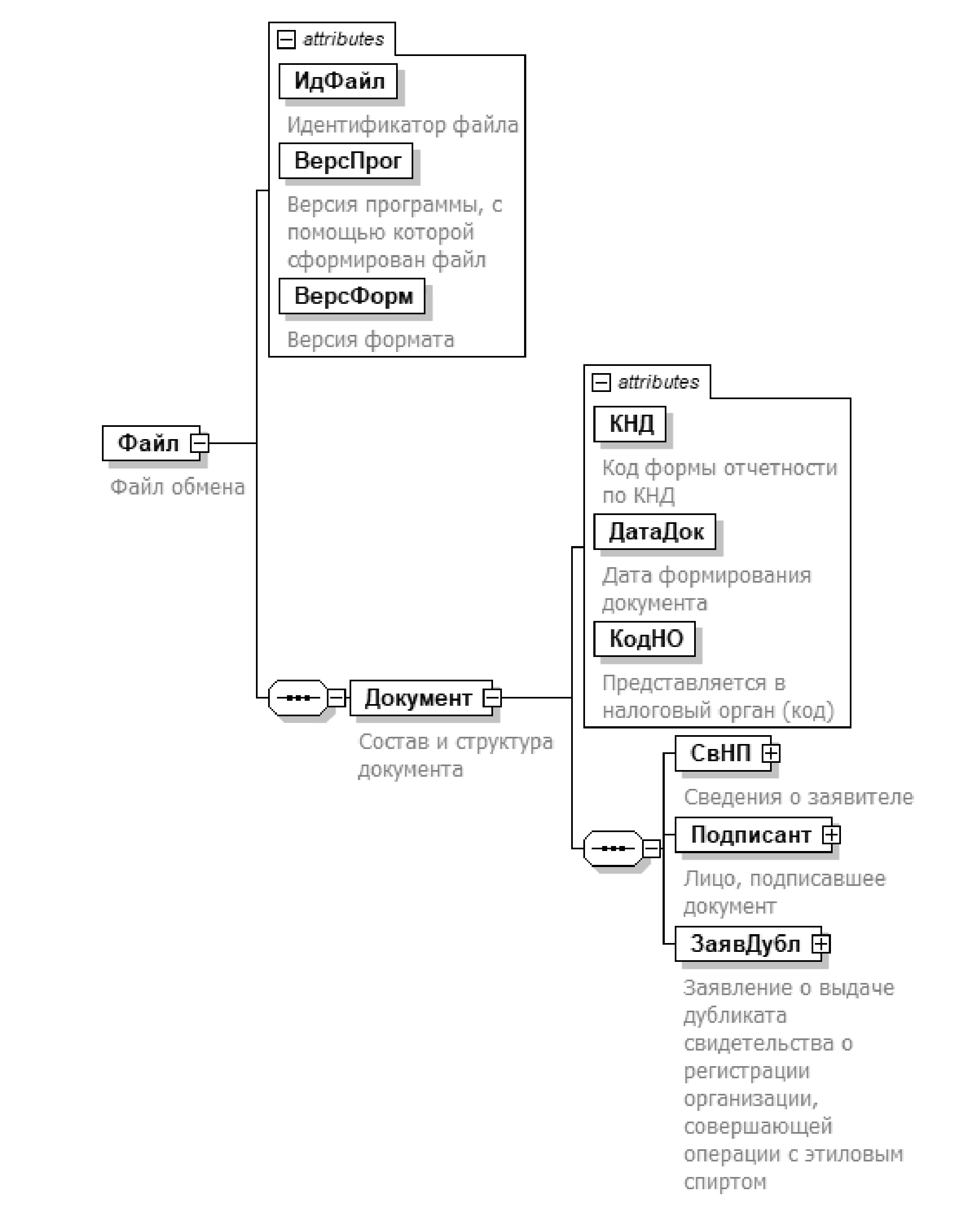 | Заявление о выдаче дубликата свидетельства о регистрации организации, совершающей операции с этиловым спиртом | ЗаявДубл | С | О | Состав элемента представлен в таблице 4.7 |