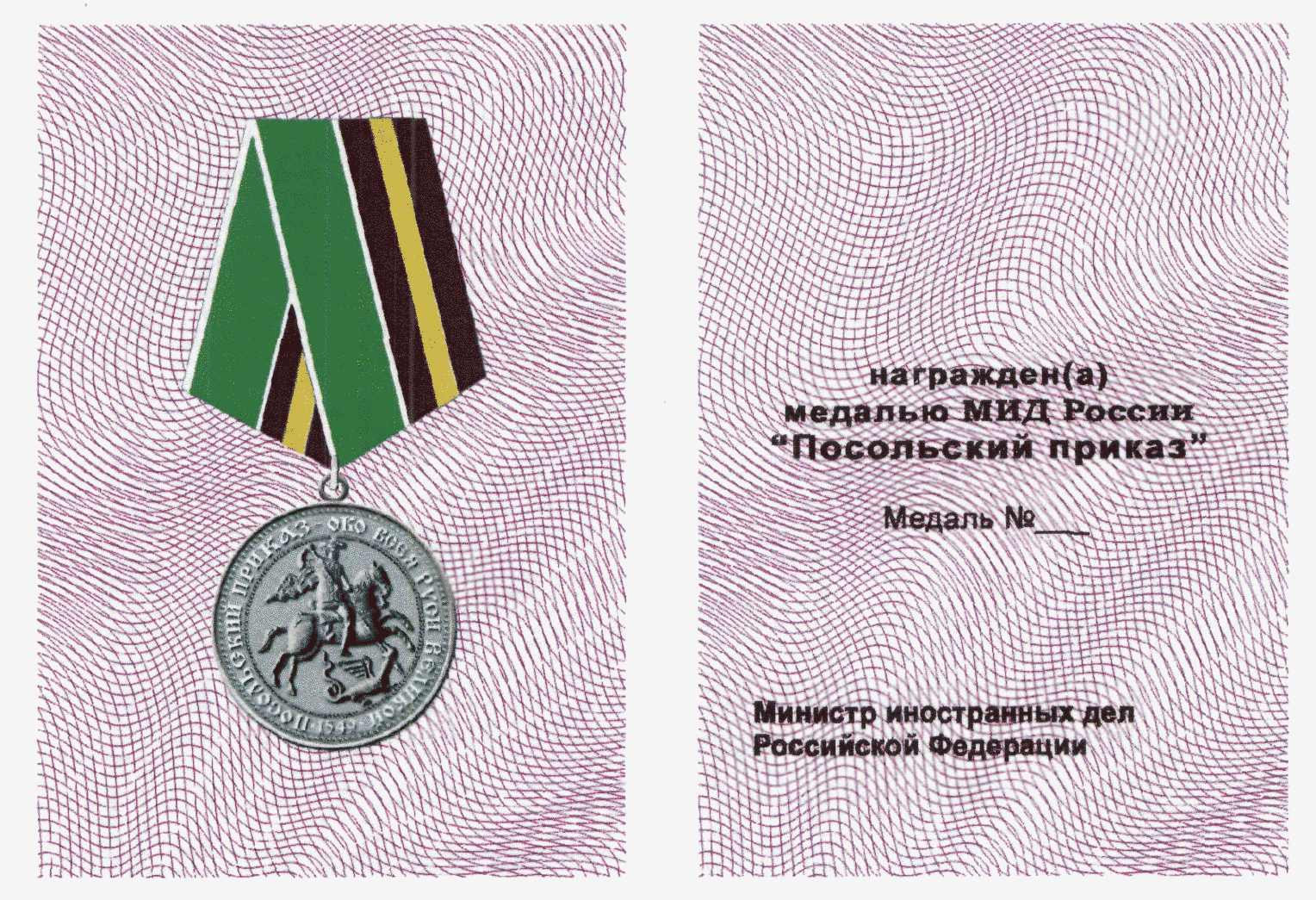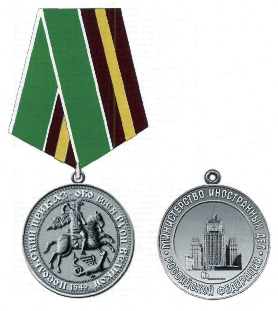 МИД учредил нагрудную медаль "Посольский приказ". Ею награждаются граждане России, иностранцы и апатриды за активную работу по отстаиванию внешнеполитического курса нашего государства, за многолетнюю дипломатическую службу и за вклад в укрепление дружественных связей с другими государствами. Приведены описание и рисунок медали.