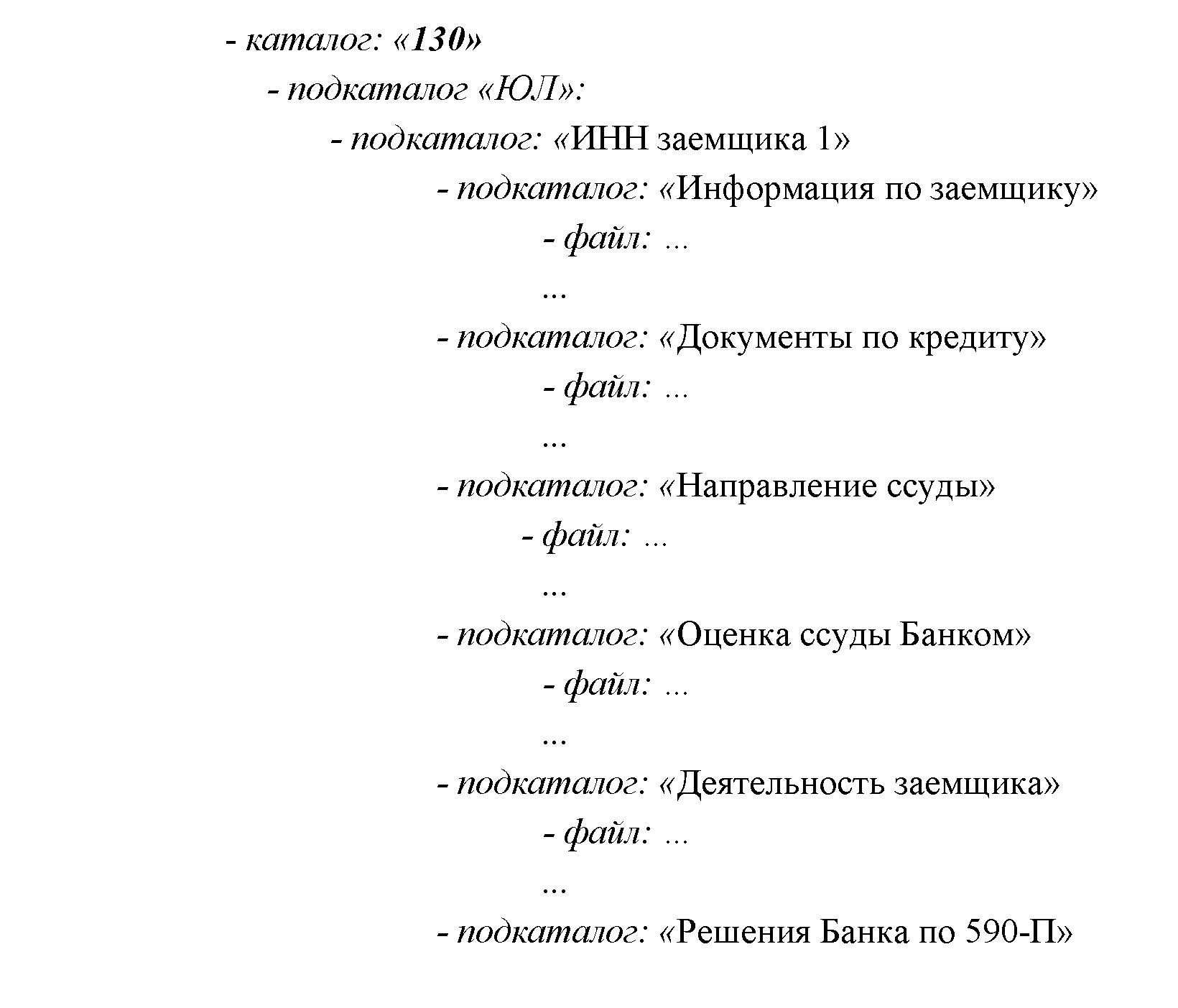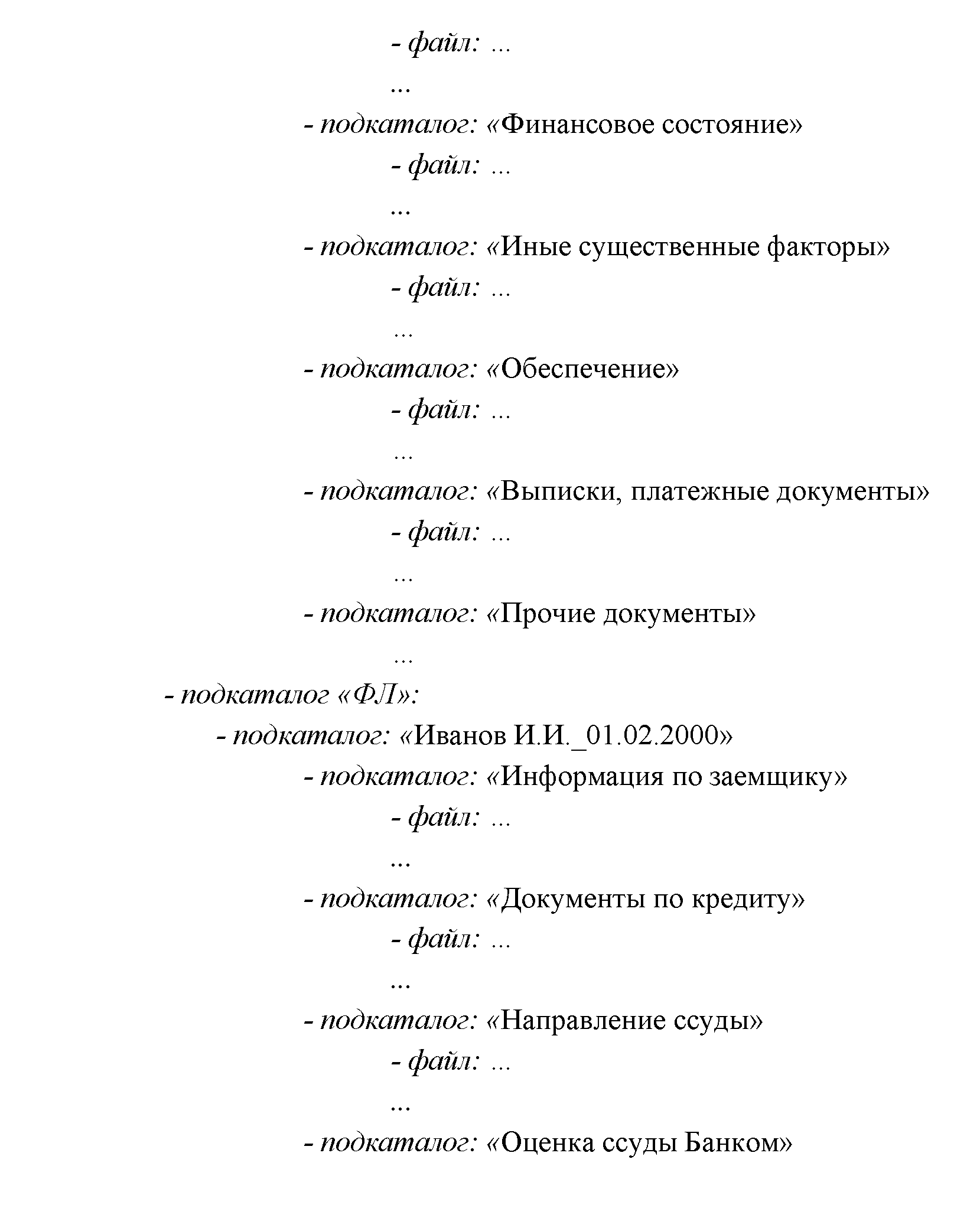 | 1. Электронное досье заемщиков состоит из документов, созданных в электронной форме без предварительного документирования на бумажном носителе (электронных документов), а также первоначально изготовленных на бумажных носителях и переведенных в электронную форму с помощью средств сканирования документов (электронных образов документов). В том числе, электронное досье содержит документы, в соответствии с которыми Банком сформированы выводы, отраженные в профессиональном суждении. 2. Электронное досье составляется по каждому заемщику с учетом следующего: - формируется директория заемщика, в наименовании которой указываются его фамилия и инициалы, день рождения, месяц рождения и последние две цифры года рождения заемщика; - в директории заемщика формируются поддиректории со следующими наименованиями, где размещаются документы (файлы) в соответствии с нижеуказанным перечнем документов. При этом количество символов в имени файла не должно превышать 65 символов на кириллице и/или латинице и/или арабских цифр. 3. Электронные документы / электронные образы документов в составе электронного досье заемщиков должны быть представлены в следующих форматах: - электронные документы формируются в форматах DOC, DOCX, RTF, XLS, XLSX - для документов с текстовым содержанием; - электронные образы документов формируются в форматах PDF, JPEG (JPG), PNG, TIF - для документов с графическим содержанием посредством сканирования документа на бумажном носителе в масштабе 1:1 в черно-белом либо сером цвете (качество не менее 300 точек на дюйм (при необходимости, в целях получения электронных документов более высокого качества, количество точек на дюйм может быть увеличено до 600)) (сканирование в режиме полной цветопередачи осуществляется при наличии в документе цветных графических изображений либо цветного текста, если это имеет значение для цели проверки). При этом рекомендуется обеспечить объем: - сканированных копий документов в формате Adobe (pdf) - не более 100 страниц в одном документе; - графических копий электронного документа, фотографии (tif, jpeg, png и т.п. ) - не более 20 мегабайт; - электронных таблиц (xls, xlsx) - не более 3000 строк. | ||