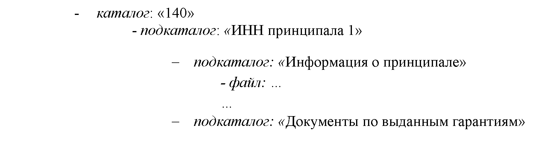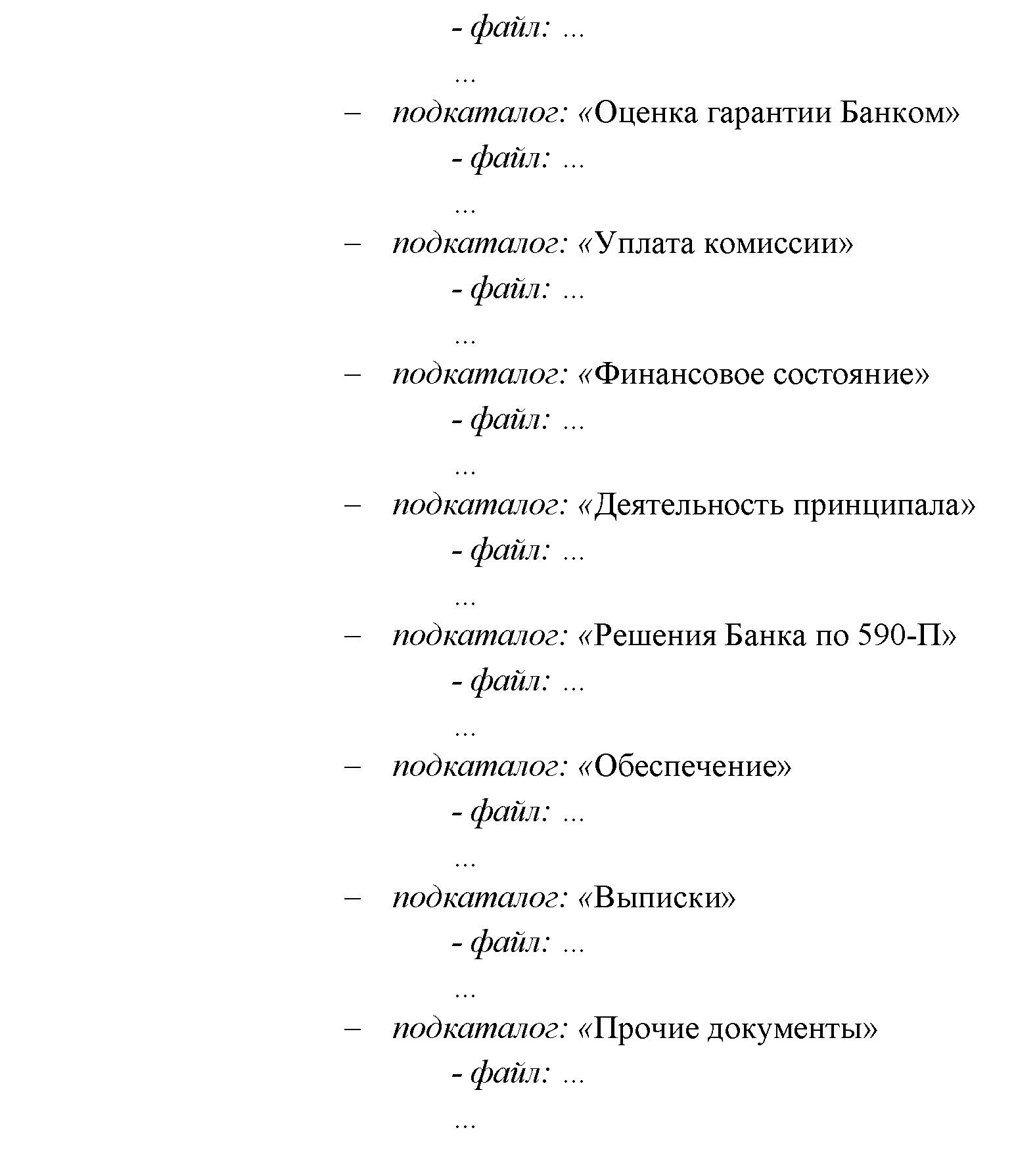 | 1. Электронное досье заемщиков состоит из документов, созданных в электронной форме без предварительного документирования на бумажном носителе (электронных документов), а также первоначально изготовленных на бумажных носителях и переведенных в электронную форму с помощью средств сканирования документов (электронных образов документов). В том числе электронное досье содержит документы, в соответствии с которыми Банком сформированы выводы, отраженные в профессиональном суждении. 2. Электронное досье составляется по каждому принципалу с учетом следующего: - формируется директория принципала, в наименовании которой указывается его ИНН; - в директории принципала формируются поддиректории со следующими наименованиями, куда размещаются документы (файлы) в соответствии с нижеуказанным перечнем документов. При этом набор символов, показывающий расположение файла в файловой системе ("путь файла"), не должен превышать 200 символов. Количество символов в наименовании файла не должно превышать 65 символов. 3. Электронные копии документов должны быть представлены Банком в следующих форматах: - DOC, DOCX, RTF, XLS, XLSX - для документов с текстовым содержанием; - PDF, JPEG (JPG), PNG, TIF - для документов с графическим содержанием. "Электронные образы документов" должны быть представлены Банком в формате PDF. "Электронные образы документов" должны быть созданы посредством сканирования документа на бумажном носителе в масштабе 1:1 в черно-белом либо сером цвете (качество не менее 300 точек на дюйм (при необходимости, в целях получения электронных документов более высокого качества, количество точек на дюйм может быть увеличено до 600)). Сканирование в режиме полной цветопередачи осуществляется при наличии в документе цветных графических изображений либо цветного текста, если это имеет значение для цели проверки. При этом рекомендуется обеспечить объем: - сканированных копий документов в формате Adobe (pdf) - не более 100 страниц в одном документе; - графических копий электронного документа, фотографии (tif, jpeg, png и т.п.) - не более 20 мегабайт; - электронных таблиц (xls, xlsx) - не более 3000 строк. | ||