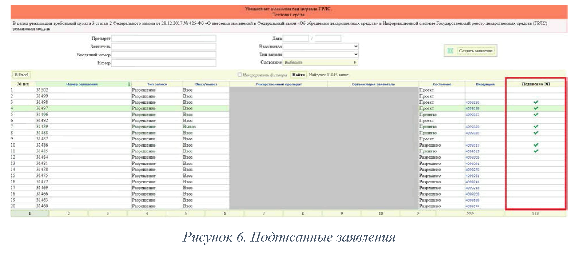 Такая же галочка отображается в реестре заявлений на ввоз (вывоз) биологических материалов напротив каждого подписанного заявления (Рисунок 6):