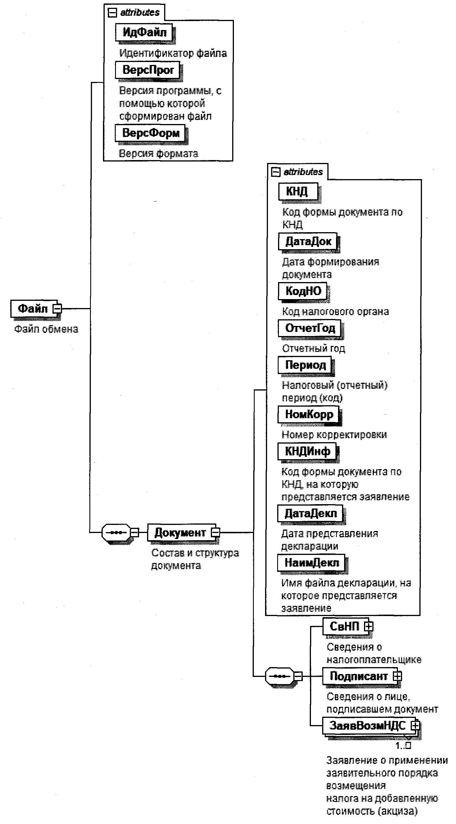 | Заявление о применении заявительного порядка возмещения налога на добавленную стоимость (акциза) | ЗаявВозмНДС | С | ОМ | Состав элемента представлен в таблице 4.7 |