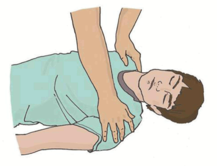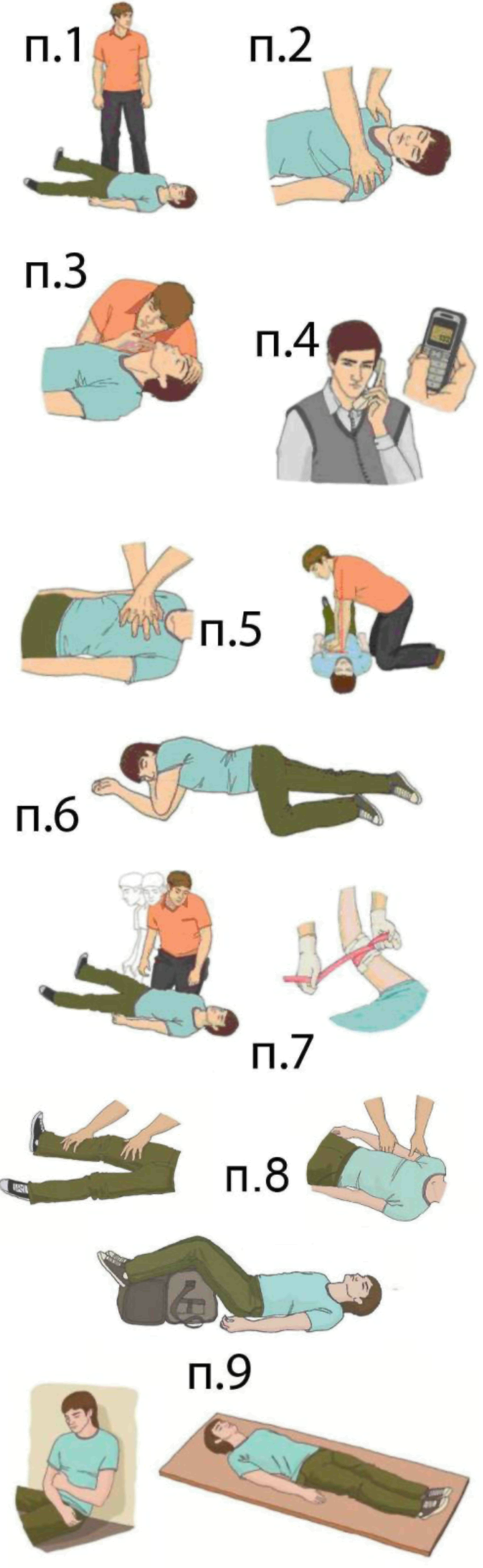 1) давления руками на грудину пострадавшего помощи (на глубину 5-6 см с частотой 100-120 в минуту);