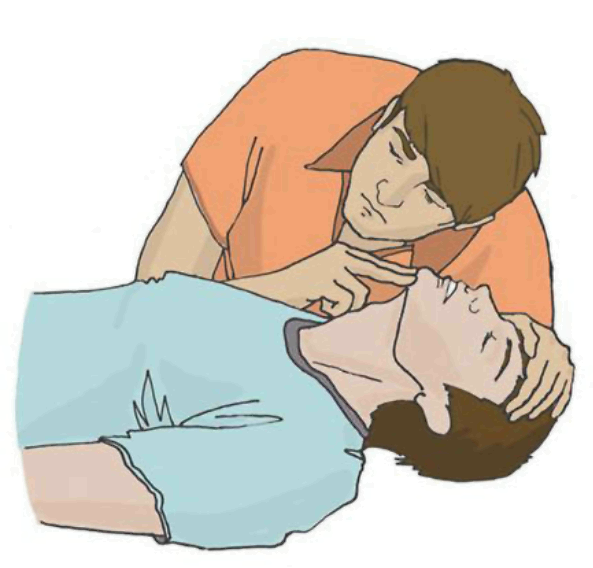 3) определить наличие нормального дыхания с помощью слуха, зрения и осязания: наклониться щекой и ухом ко рту и носу пострадавшего и в течение 10 сек. попытаться услышать его дыхание, почувствовать выдыхаемый воздух на своей щеке и увидеть движения грудной клетки у пострадавшего. При наличии дыхания перейти к п. 6 "Инструкции..."; при отсутствии дыхания перейти к п. 4 "Инструкции".