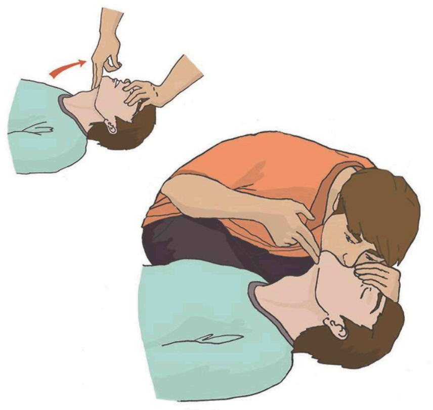 | 3. Восстановите проходимость дыхательных путей пострадавшего и определите признаки жизни (определите наличие нормального дыхания с помощью слуха, зрения и осязания). При наличии дыхания переходите к п. 6 Алгоритма. | |