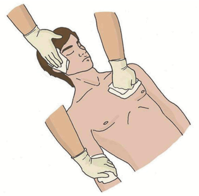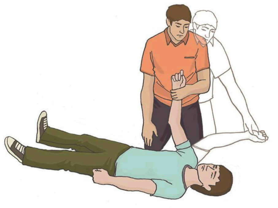 | 7. Проведите обзорный осмотр пострадавшего для обнаружения наружного кровотечения и остановите его (выполните прямое давление на рану, наложите давящую повязку). При невозможности или неэффективности этих действий осуществите пальцевое прижатие артерии и наложите кровоостанавливающий жгут; или выполните максимальное сгибание конечности в суставе. | |