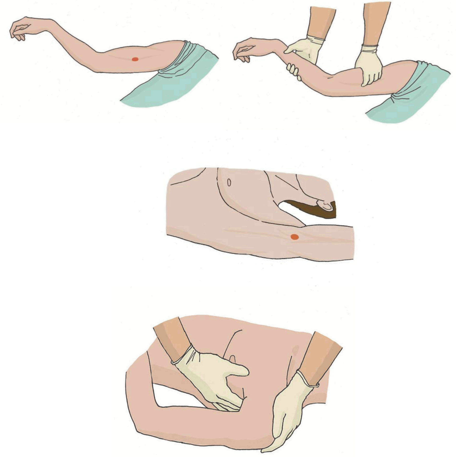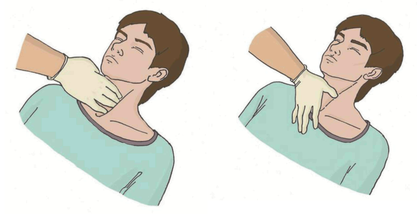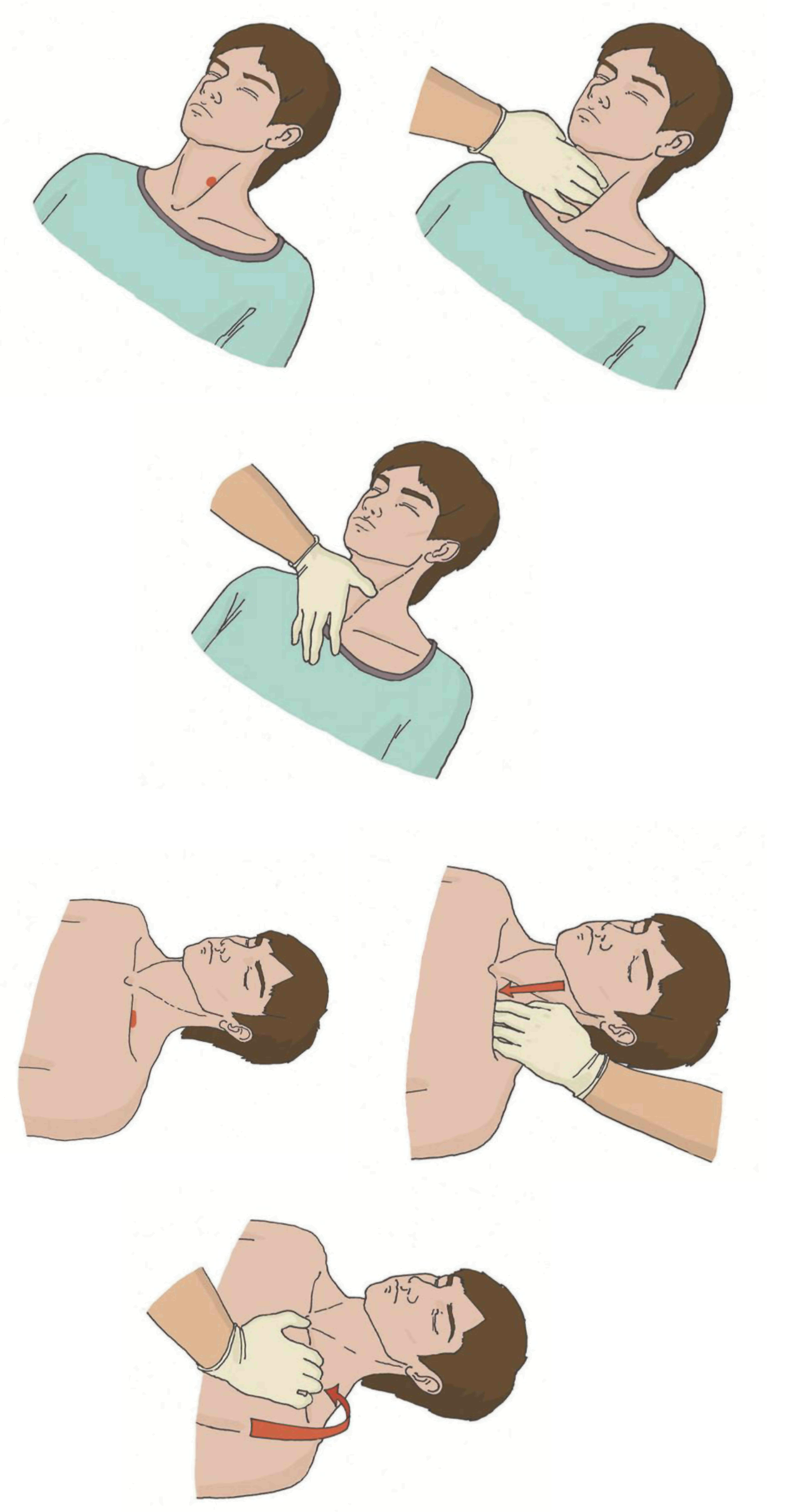 2) при травмах шеи - остановить кровотечение прямым давлением на рану, наложением давящей повязки или пальцевым прижатием артерии.