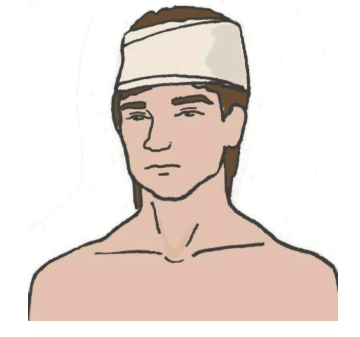 1) при травмах головы - остановить кровотечение прямым давлением на рану, наложить повязку.