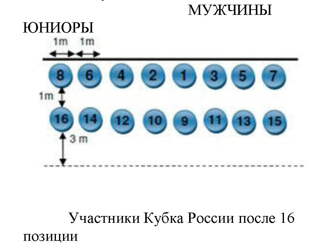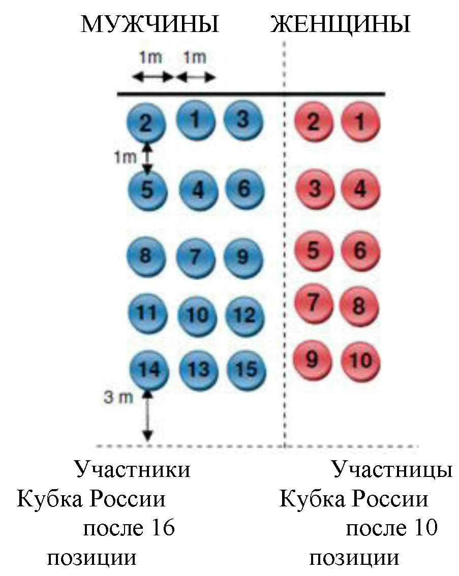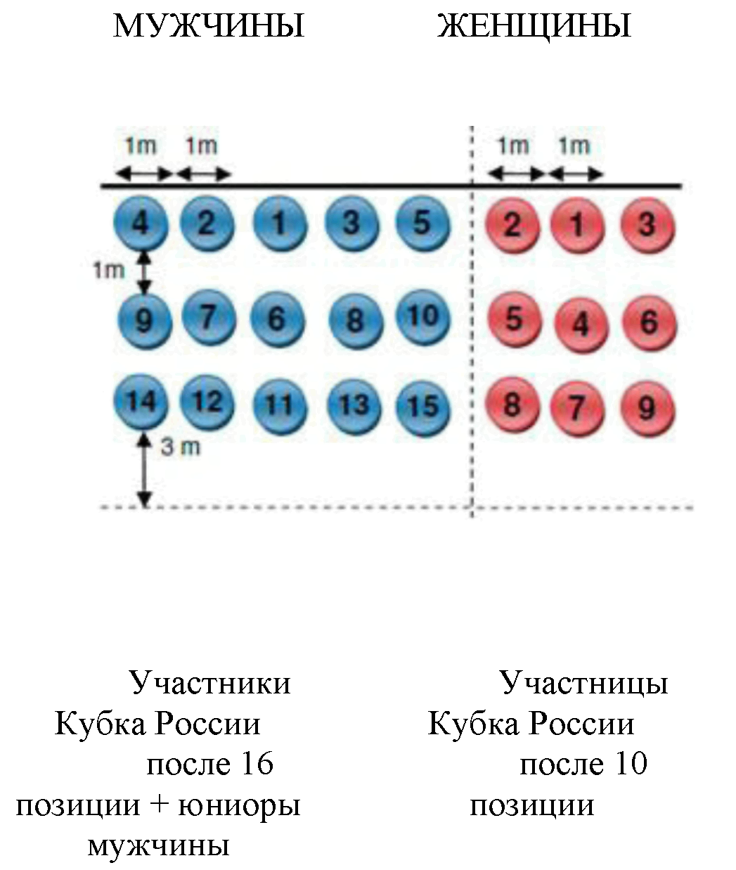 Разделительные линии между мужчинами и женщинами (или женщинами и юниорами, см. ниже) следует делать флажками и краской. Участники не могут пересекать эти линии.