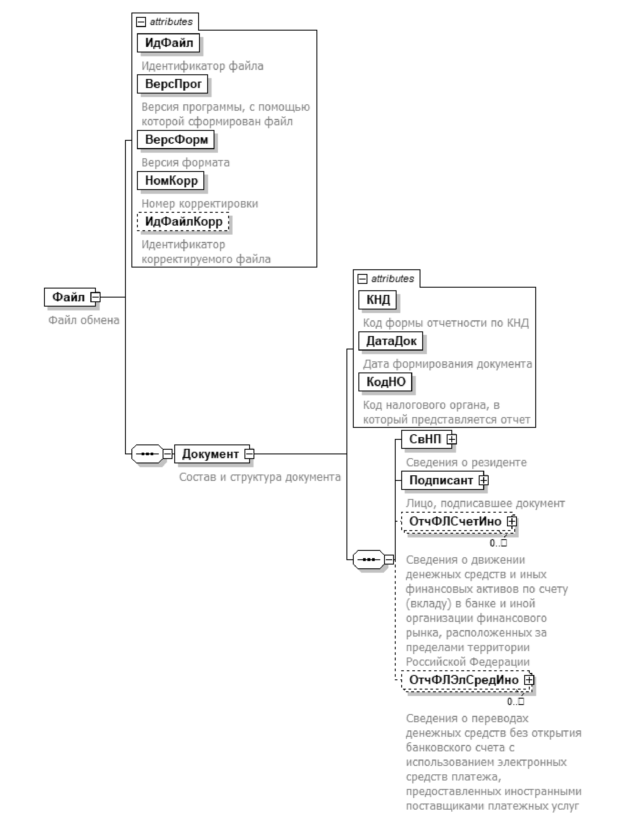 | Сведения о движении денежных средств и иных финансовых активов по счету (вкладу) в банке и иной организации финансового рынка, расположенных за пределами территории Российской Федерации | ОтчФЛСчетИно | С | НМУ | Состав элемента представлен в таблице 4.7. Элемент должен отсутствовать при значении элемента <НомКорр> = 999 (таблица 4.1). Элемент является обязательным при отсутствии элемента <ОтчФЛЭлСредИно> и при значении элемента <НомКорр> ? 999 (таблица 4.1). Элемент может быть заполнен при наличии элемента <ОтчФЛЭлСредИно> и при значении элемента <НомКорр> ? 999 (таблица 4.1) | |