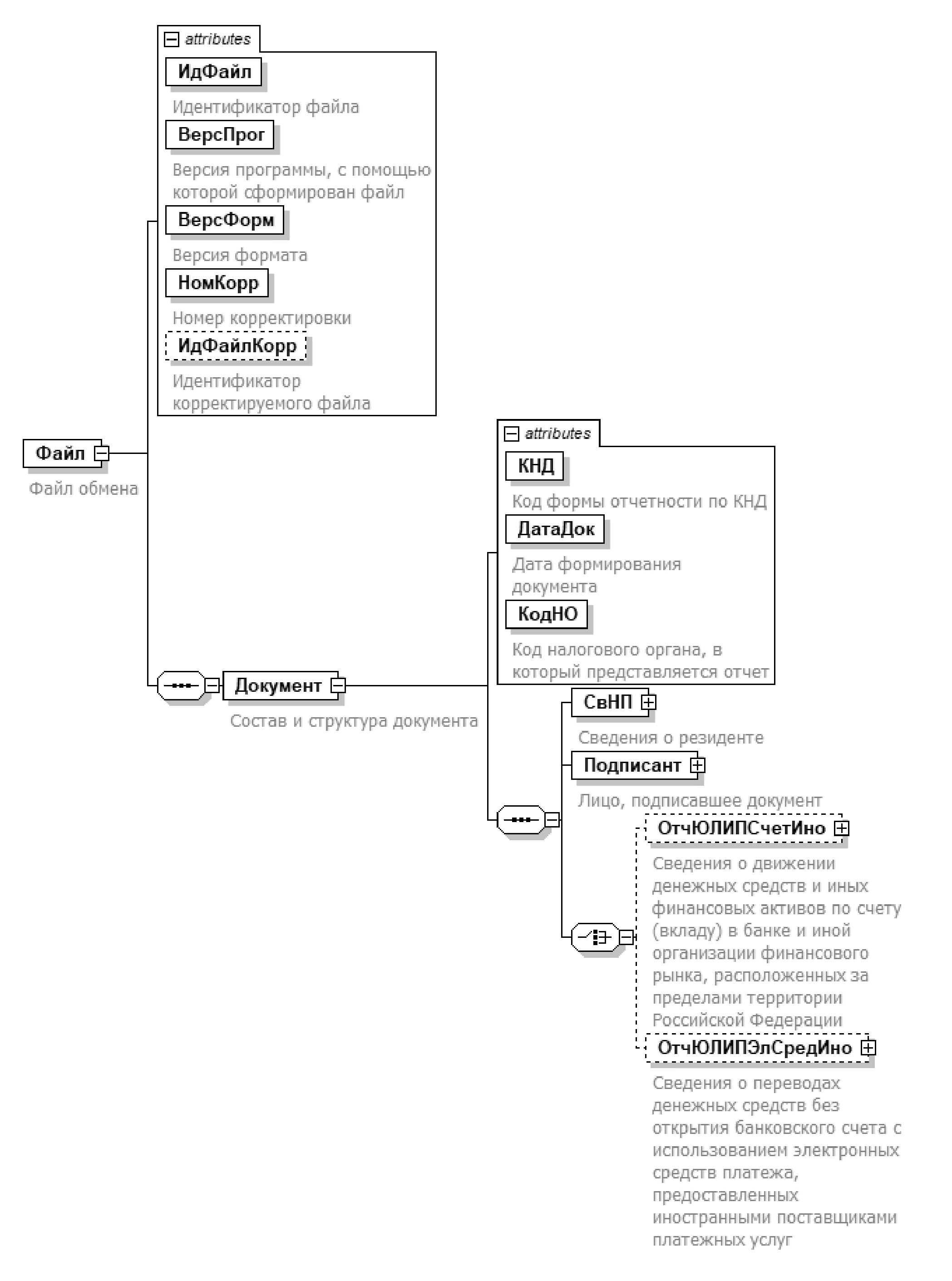 | Сведения о движении денежных средств и иных финансовых активов по счету (вкладу) в банке и иной организации финансового рынка, расположенных за пределами территории Российской Федерации | | ОтчЮЛИПСчетИно | С | НУ | Состав элемента представлен в таблице 4.9. Элемент должен отсутствовать при значении элемента <НомКорр> = 999 (таблица 4.1). Элемент должен присутствовать при отсутствии элемента <ОтчЮЛИПЭлСредИно> и при значении элемента <НомКорр> ? 999 (таблица 4.1) | |