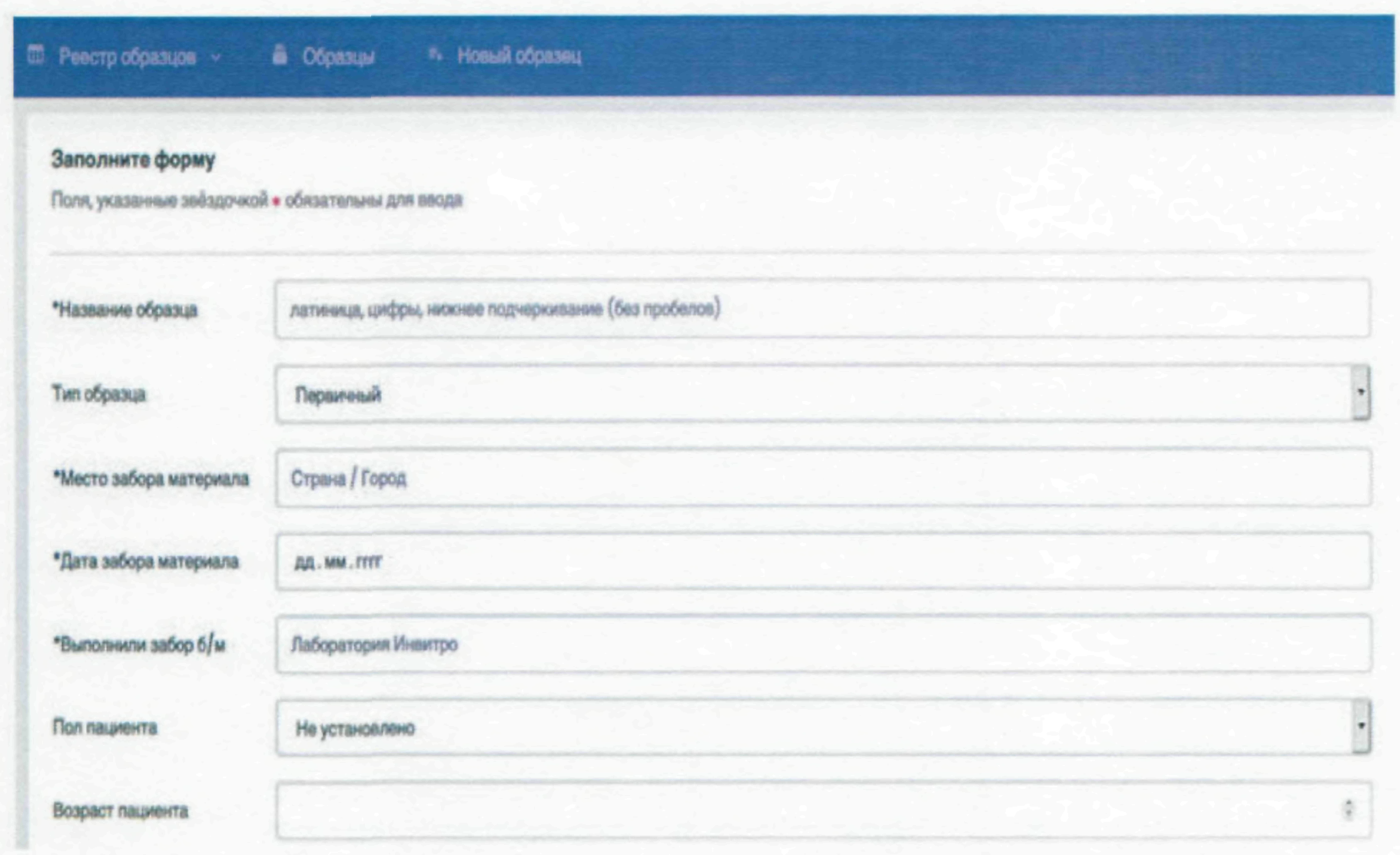- *Дата забора материала в формате (ГГГГ или ГГГГ-ММ или ГГГГ-ММ-ДД)