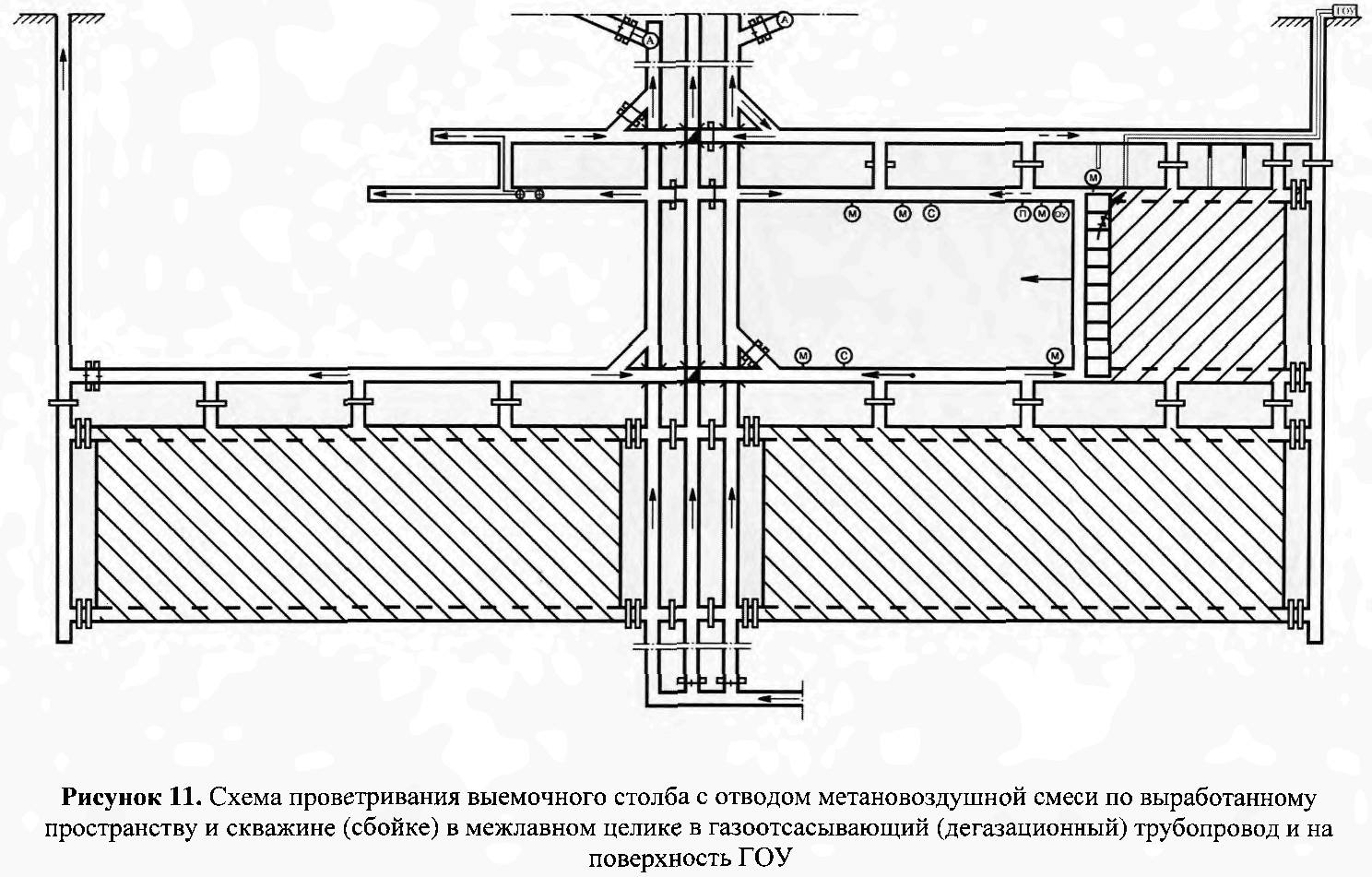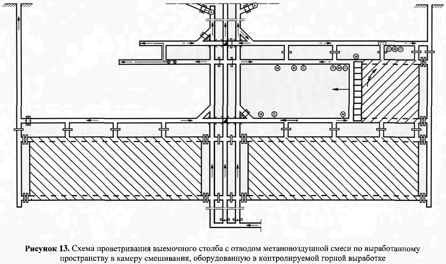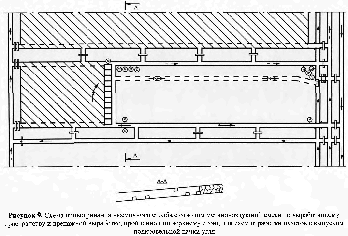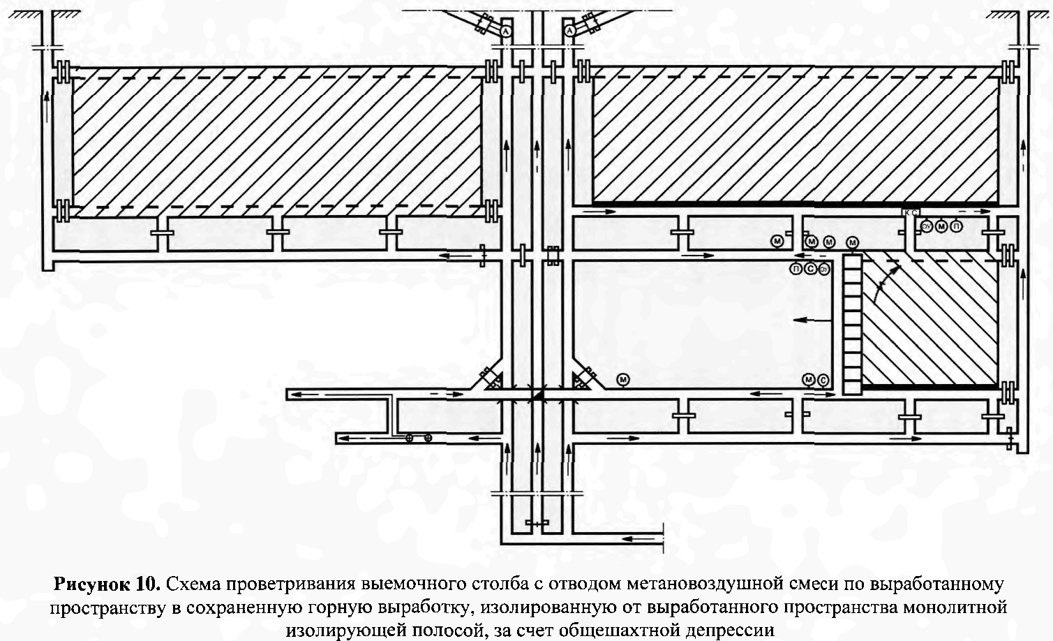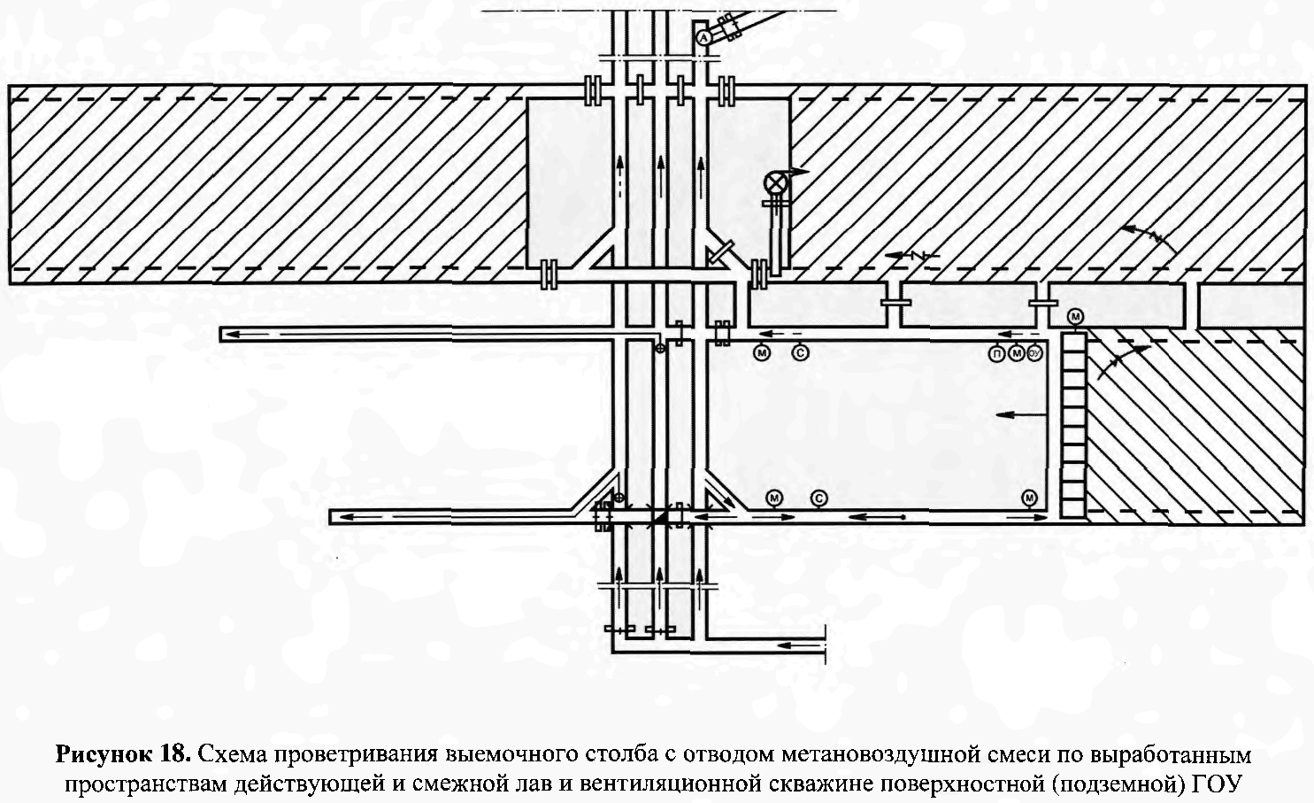 | Тупиковые части погашаемых выработок по всей их длине | Средняя скорость движения воздуха в 10 м от завала или перемычки, изолирующей погашенную часть, меньше 1 м/с | Под кровлей выработки у завала или перемычки, изолирующей погашенную часть, и у входа в тупик, а также через 15-20 м по всей длине тупика | |