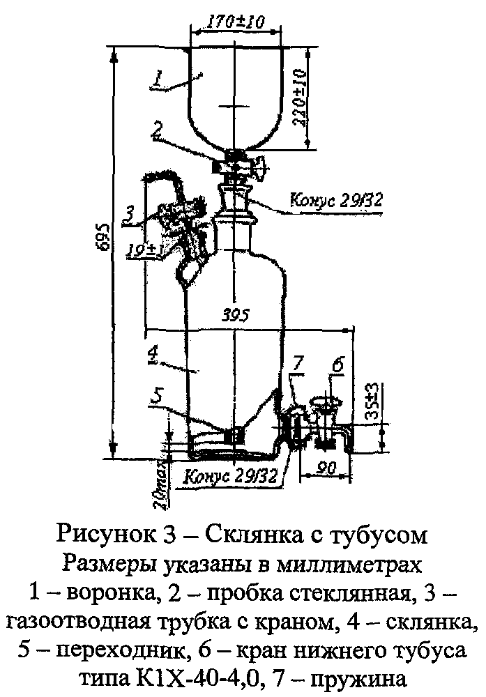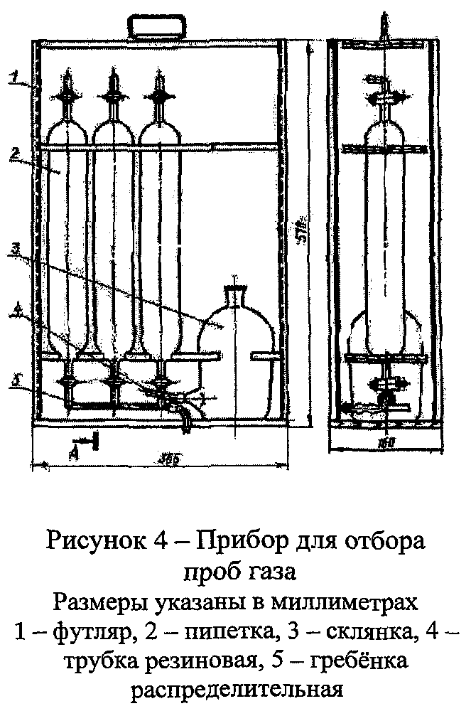 Объём кислорода, пропущенный через поглотительный раствор, измеряют с помощью склянки с тубусом (рис. 3) или прибора для отбора проб газа (рис. 4), присоединенного к короткой трубке склянки (рис. 1 или 2) на выходе газа.