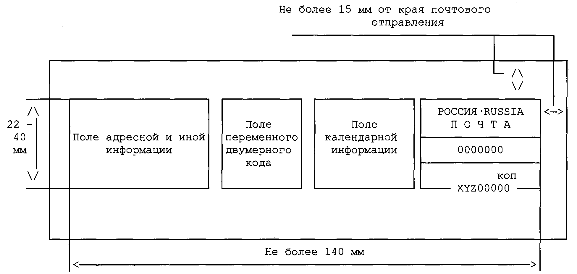 государственный знак почтовой оплаты - помещенные в прямоугольную рамку названия государства буквами русского алфавита "РОССИЯ" и буквами латинского алфавита "RUSSIA", слово "ПОЧТА", нанесенное буквами русского алфавита или буквами латинского алфавита, число (не менее 7 переводных разрядов), обозначающее сумму оплаты услуг почтовой связи по пересылке почтовых отправлений, слово "КОП", номер, состоящий из условного буквенного обозначения изготовителя и заводского серийного номера франкировальной машины или франкировального модуля (если конструкцией франкировальной машины предусмотрено наличие франкировального модуля), номер, состоящий из условного буквенного обозначения изготовителя и заводского серийного номера франкировальной машины или франкировального модуля (если конструкцией франкировальной машины предусмотрено наличие франкировального модуля);