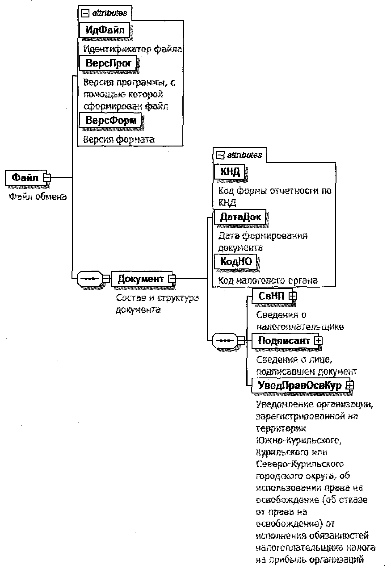 | Уведомление организации, зарегистрированной на территории Южно-Курильского, Курильского или Северо-Курильского городского округа, об использовании права на освобождение (об отказе от права на освобождение) от исполнения обязанностей налогоплательщика налога на прибыль организаций | УведПравОсвКур | С | О | Состав элемента представлен в таблице 4.7 |
