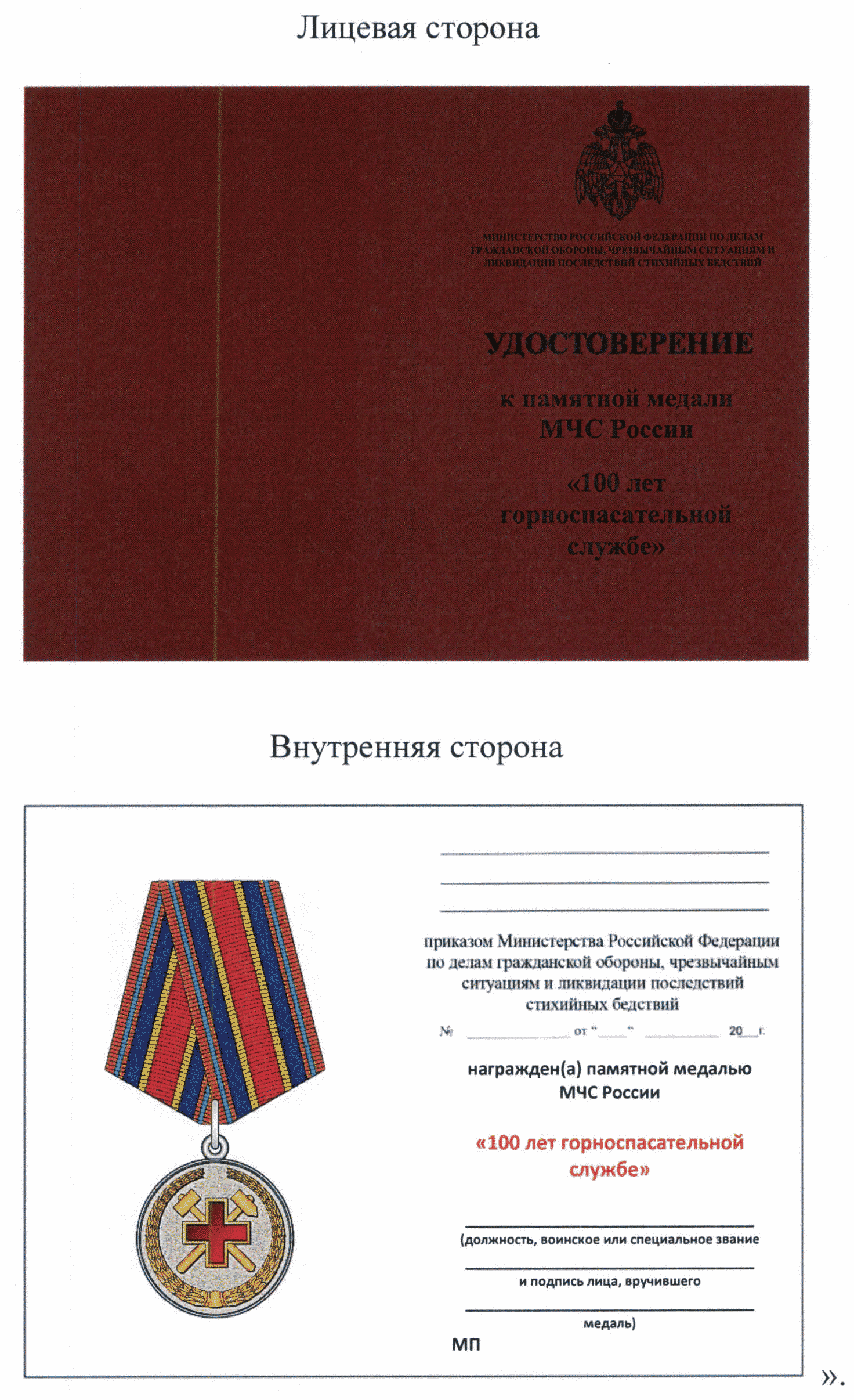 Форма удостоверения к памятной медали МЧС России "100 лет горноспасательной службе"