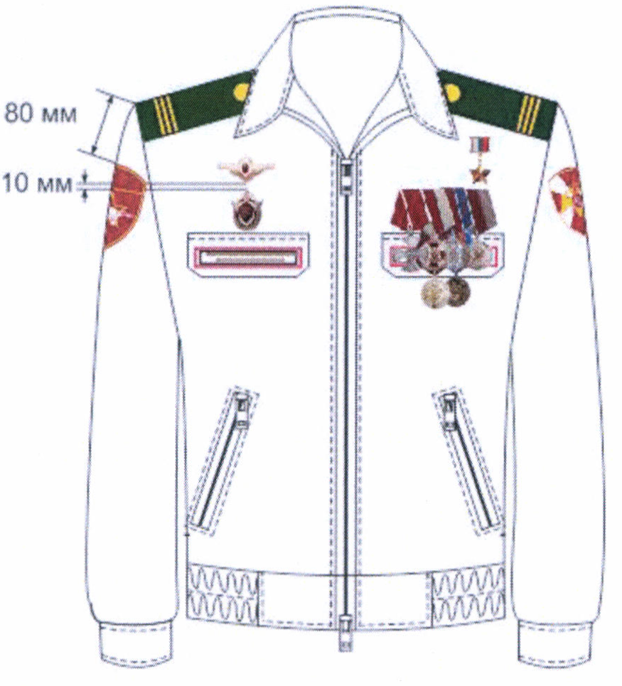 в) на фланелевке или форменке - на 10 мм левее воротника так, чтобы нижние концы звезды находились на 80 мм выше угла выреза воротника;