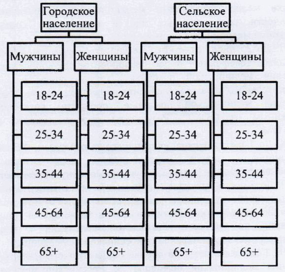 2. Выборка разбивается на городское и сельское население, а также по полу (мужской, женский) и возрасту. Выделяется пять возрастных групп: 18 - 24; 25 - 34; 35 - 44; 45 - 64; 65+ лет. Таким образом, совокупное число групп для каждого субъекта Российской Федерации 20 (Схема 1).