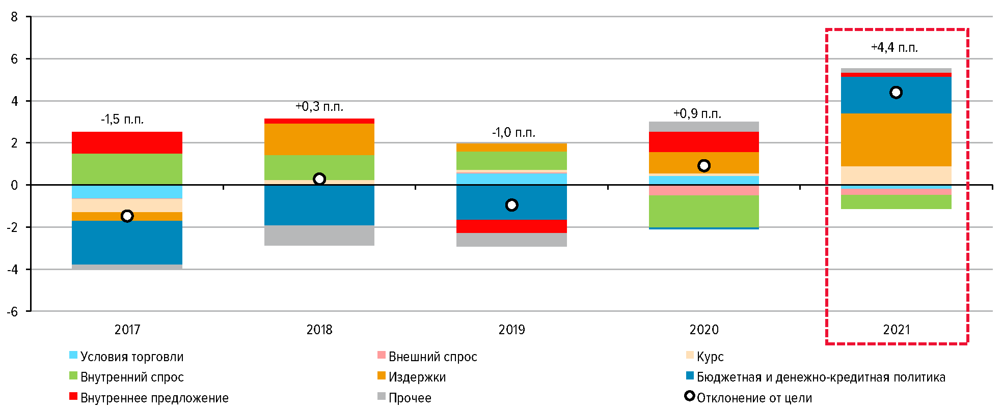 Банк России стремится поддерживать инфляцию вблизи 4% постоянно. В случае действия на прогнозном горизонте факторов, которые могут привести к отклонению инфляции от цели, Банк России оценивает их причины и продолжительность возможного влияния на инфляцию и исходя из этого принимает решения о мерах денежно-кредитной политики. В ситуации отклонения инфляции от цели скорость возвращения к ней выбирается Банком России с учетом масштаба этого отклонения и влияния мер денежно-кредитной политики на экономическую активность. Кроме того, принимая такие решения, Банк России учитывает риски для финансовой стабильности.