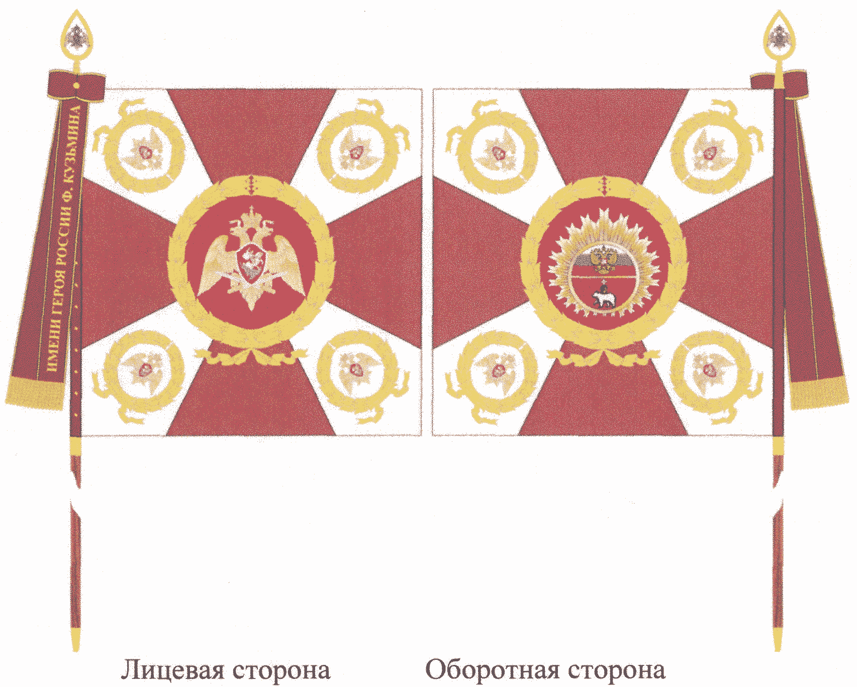 Под щитом - развевающаяся краповая девизная лента с надписью золотыми литерами: "ИМЕНИ ГЕРОЯ РОССИИ Ф. КУЗЬМИНА".