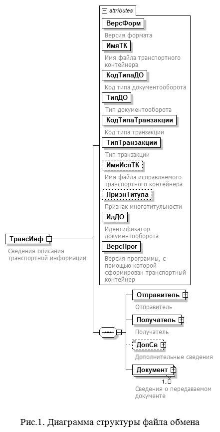 4. Логическая модель файла обмена представлена в виде диаграммы структуры файла обмена на рисунке 1 настоящего формата. Элементами логической модели файла обмена являются элементы и атрибуты XML файла. Перечень структурных элементов логической модели файла обмена и сведения о них приведены в таблицах 4.1-4.6 настоящего формата.