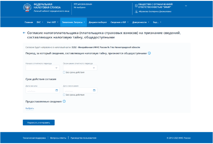 | 3 | Поле «Период, за который раскрываются сведения, составляющие налоговую тайну» | с 2022 (для организаций, созданных в текущем году, - с 2023) по «без срока действия» |