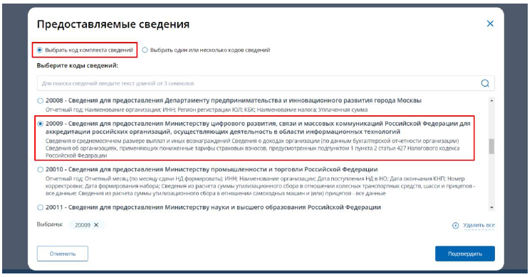нажмите «Выбрать», далее откроется окно, в котором необходимо отметить пункт «Выбрать код комплекта сведений», а также найти и выбрать код комплекта «20009» в предложенном списке