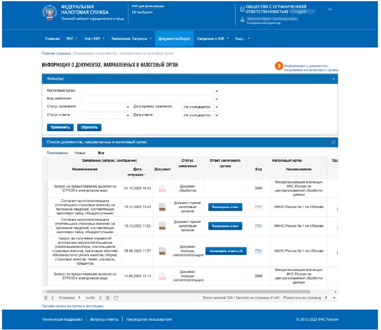 Рис. 4. Информация о документах, направленных в налоговый орган