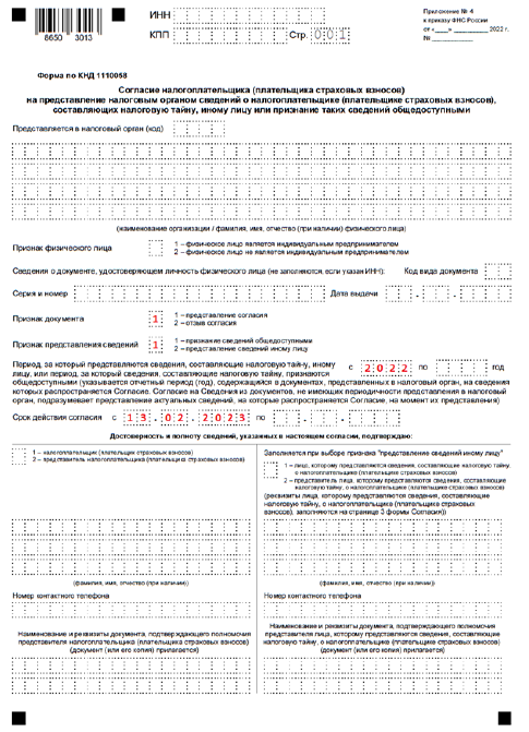 Чтобы это сделать, подайте в ФНС согласие на раскрытие этих сведений (далее - Согласие). На текущий момент действует форма Согласия версии 5.03 (КНД 1110058) (Приложение № 4 к приказу ФНС от 14.11.2022 № ЕД-7- 19/1085@)