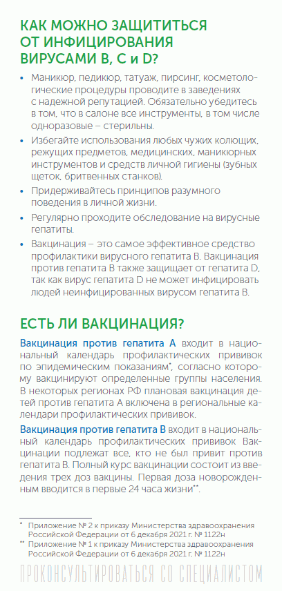 От заражения вирусами гепатитов В и С не застрахован никто. Инфицирование возможно при любых манипуляциях, проводимых с повреждением кожных или слизистых покровов, в том числе при нанесении татуировок, проведении косметических и косметологических процедур, при лечении у стоматолога, переливании крови и других медицинских вмешательствах. Также можно заразиться при незащищенном половом контакте, если партнер инфицирован. Контактно-бытовой путь передачи вирусов В, С и D возможен при тесном контакте и нарушении правил личной гигиены - использовании общих маникюрных принадлежностей, бритв и зубных щеток.