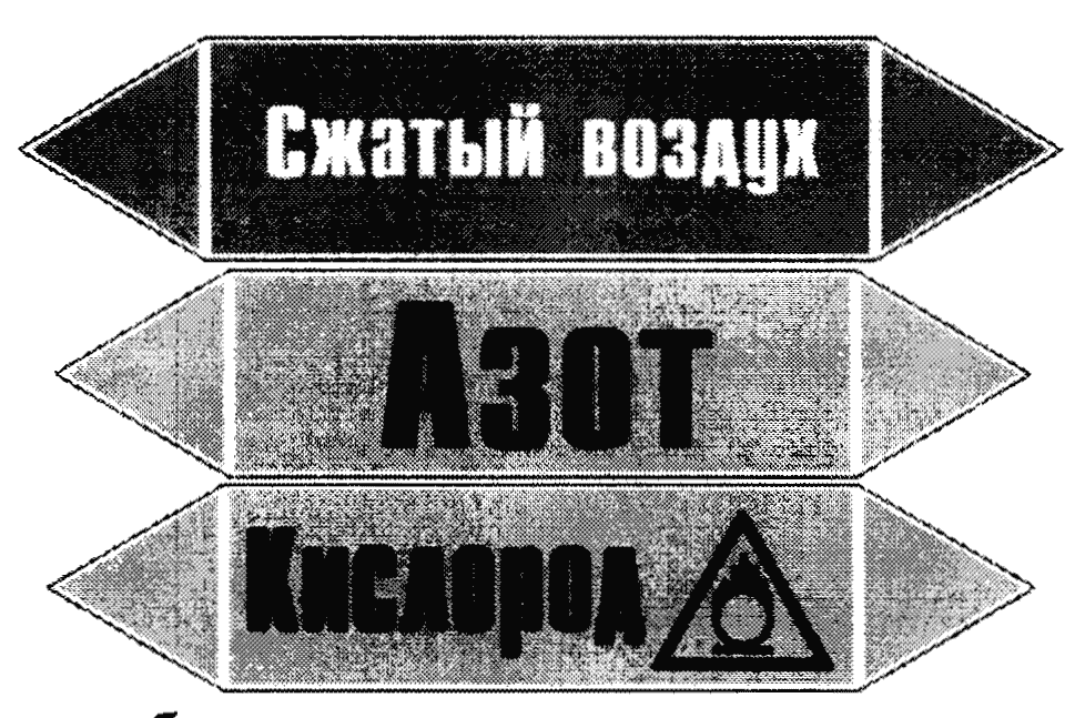 В.3. Пример указателей на трубопроводах подачи воздуха, газовой смеси (азот) и кислородообогащенной смеси (кислород) приведены на рисунке В.1 настоящего приложения. При этом надпись "Азот" может быть заменена на "Гипоксическая смесь", "кислородообедненная смесь" или "Атмосфера с пониженным содержанием кислорода".