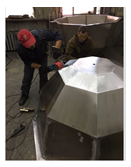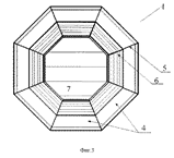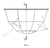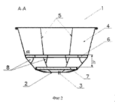 - днище выполнено плоским в форме равностороннего многоугольника, стороны многоугольника сопряжены с нижними основаниями трапециевидных граней нижнего ряда.