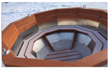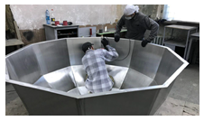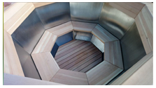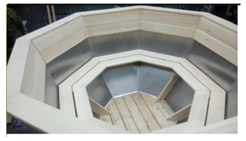 "1. Устройство для купания, выполненное в виде металлической емкости, содержащей днище и стенки, которые включают горизонтальные ряды, расположенные под углом друг к другу, каждый из рядов выполнен плоскими трапециевидными гранями, сопряженными между собой боковыми сторонами, а меньшее основание трапециевидной грани одного ряда сопрягается с большим основанием трапециевидной грани нижерасположенного ряда, при этом сопряжение граней выполнено с образованием ребер, а днище выполнено плоским в форме равностороннего многоугольника, стороны многоугольника сопряжены с нижними основаниями трапециевидных граней нижнего ряда, отличающееся тем, что дополнительно содержит настил, расположенный в нижней части емкости, и, как минимум, одно сиденье, закрепленное внутри емкости, при этом расстояние от сиденья до настила составляет от 25 до 35 см.