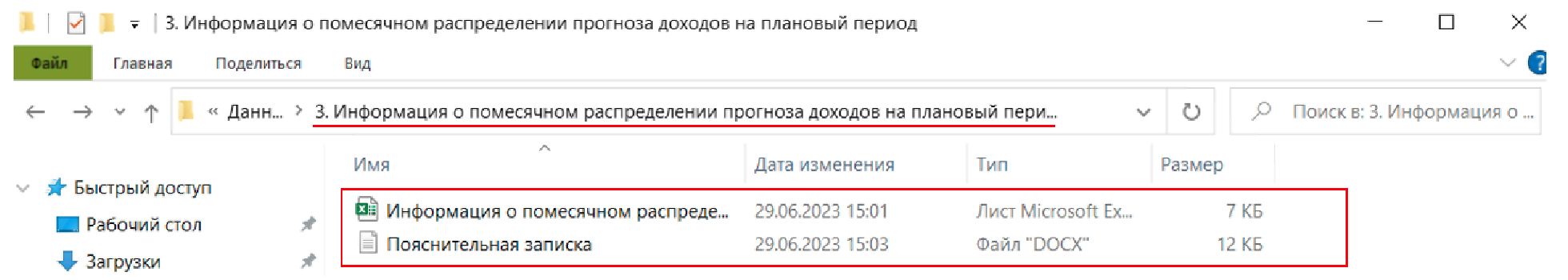 1.3. В папке "Информация о помесячном распределении прогноза доходов на плановый период" должны лежать 2 файла, а именно: