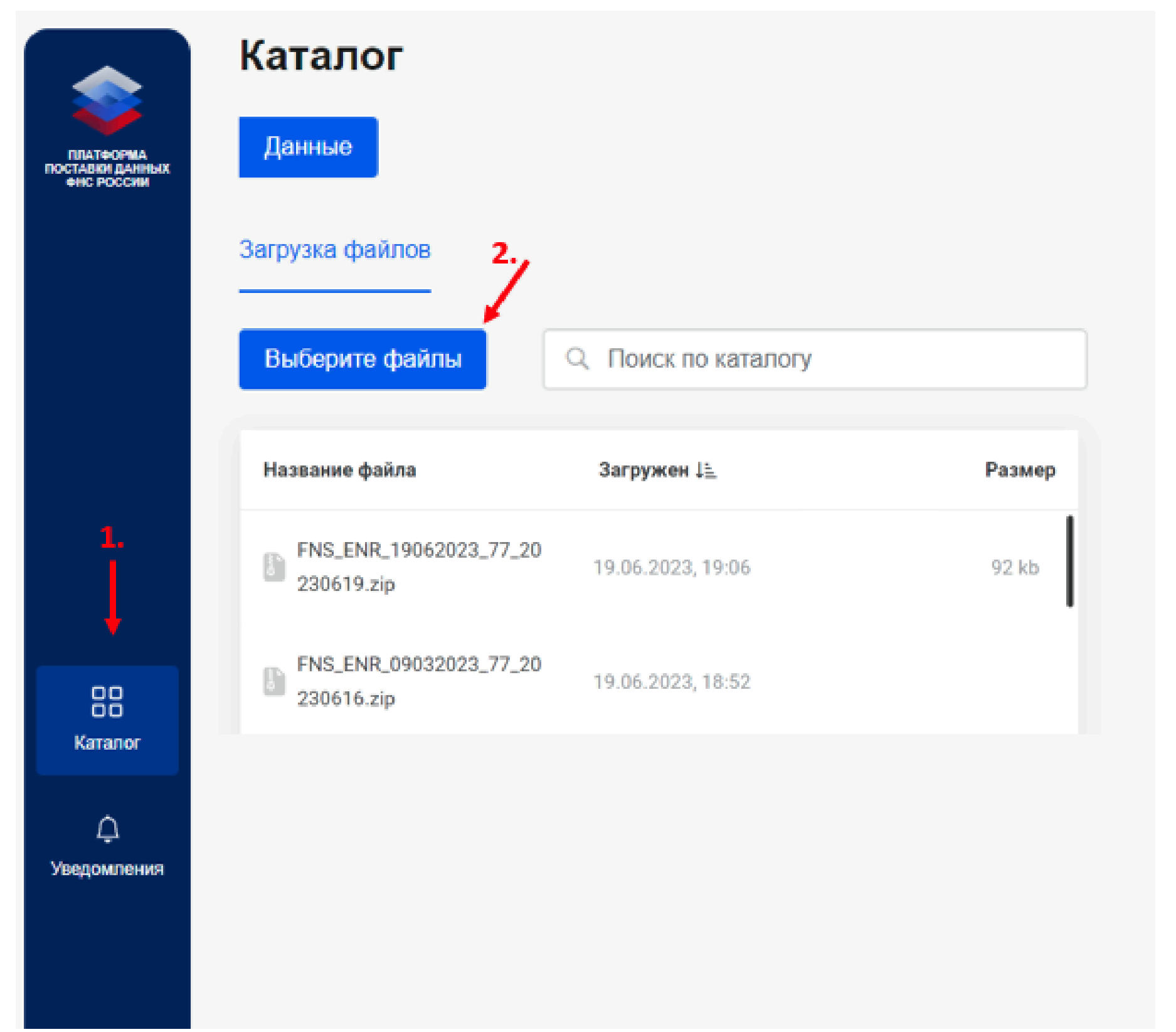 2. Перейти в пункт меню "Каталог", раздел "Загрузка файлов"