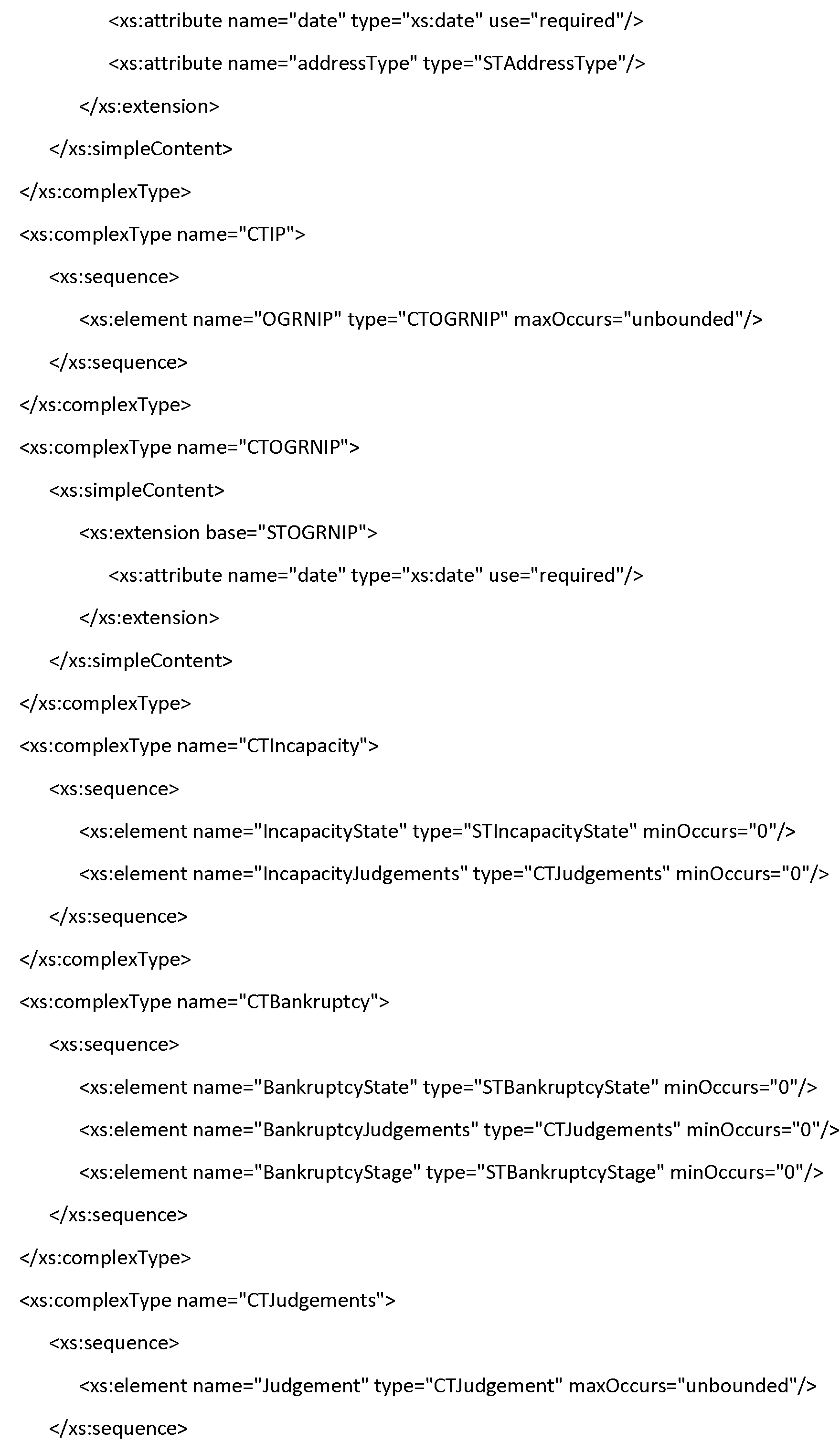 | OtherJudgements | Судебные споры, которые не удалось сопоставить с обязательствами по кредиту либо с банкротством субъекта - юридического лица. Заполняется при наличии соответствующей информации в кредитной истории субъекта. Сведения о банкротстве субъекта - юридического лица отражаются в виде элемента Bankruptcy в структуре элемента Subject для юридического лица (Таблица Ф.6). | Составной тип Таблица Ф.12 | Нет |