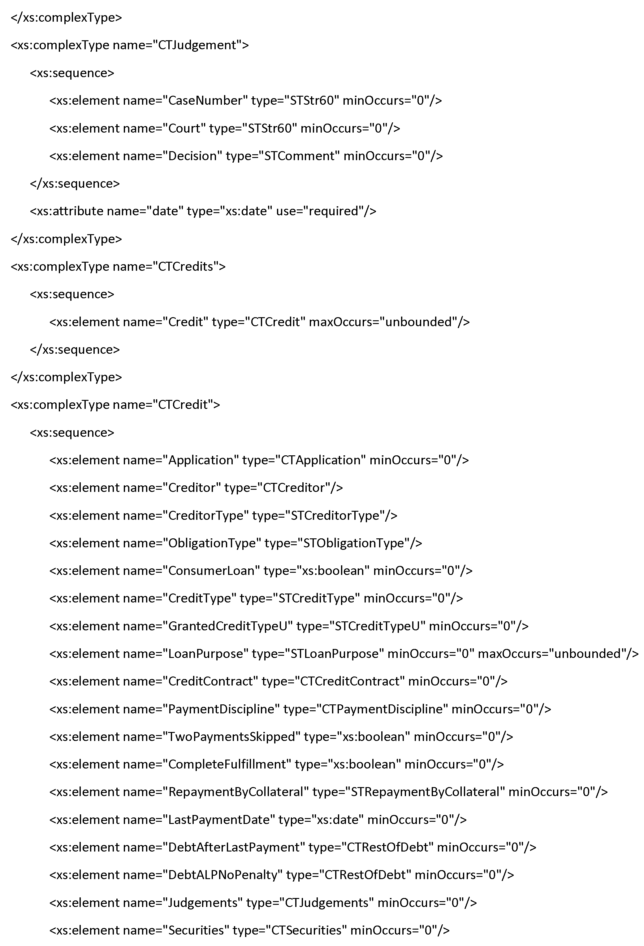 | OtherJudgements | Судебные споры, которые не удалось сопоставить с обязательствами по кредиту либо с недееспособностью субъекта - физического лица. Заполняется при наличии соответствующей информации в кредитной истории субъекта. Сведения о судебных спорах и требованиях по обязательству отражаются в виде элемента Judgements в структуре элемента Credit (Таблица Ф.15). Решения суда о дееспособности субъекта кредитной истории отражаются в виде элемента Incapacity в структуре элемента Subject для физического лица (Таблица Ф.5). | Составной тип Таблица Ф.12 | Нет |
