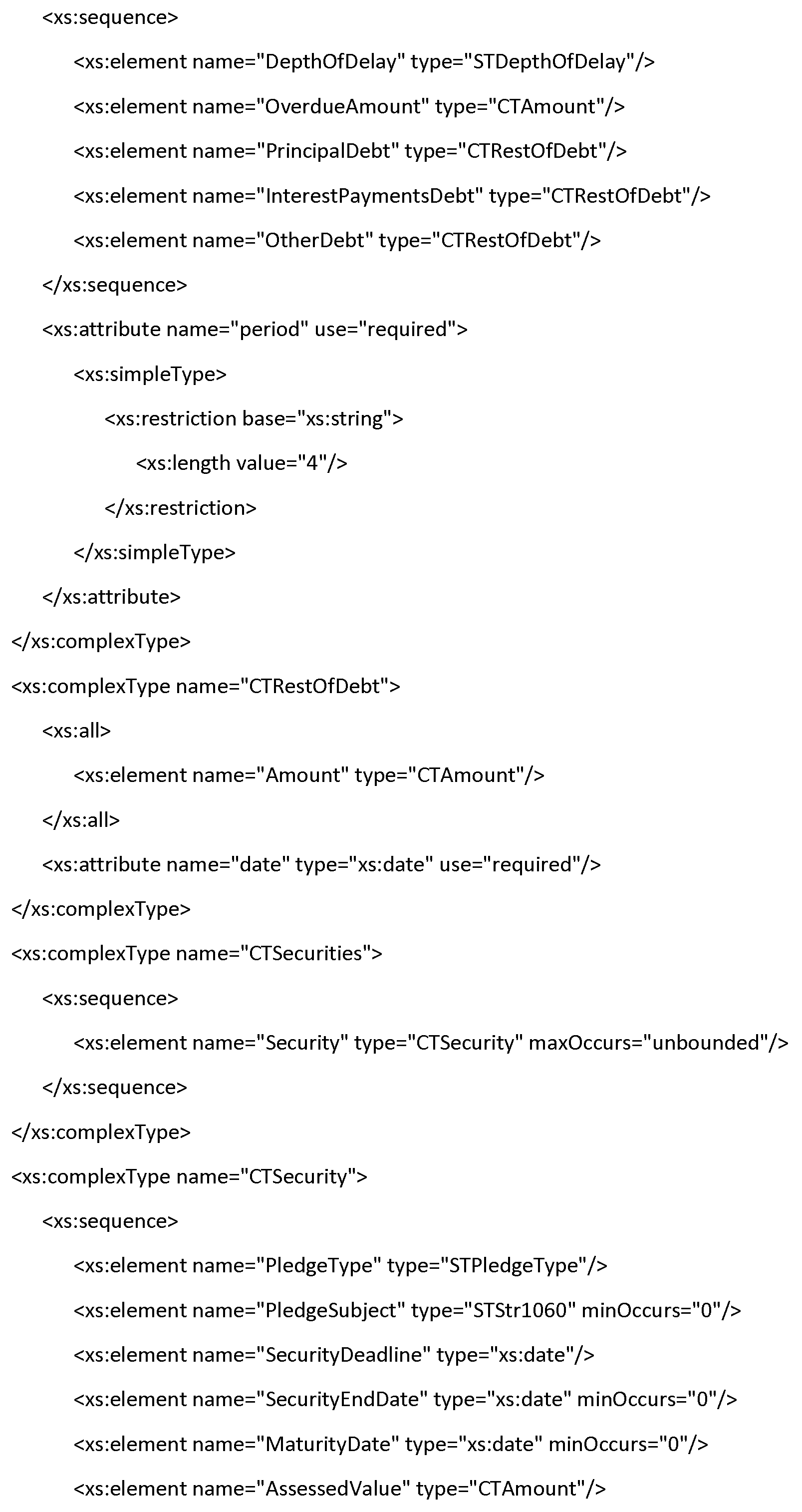 | Security | Предмет залога, срок действия договора залога, оценка предмета залога с указанием даты ее проведения. Элемент повторяется при наличии нескольких предметов залога по обязательству. | Составной тип Таблица Ф.25 | Да |