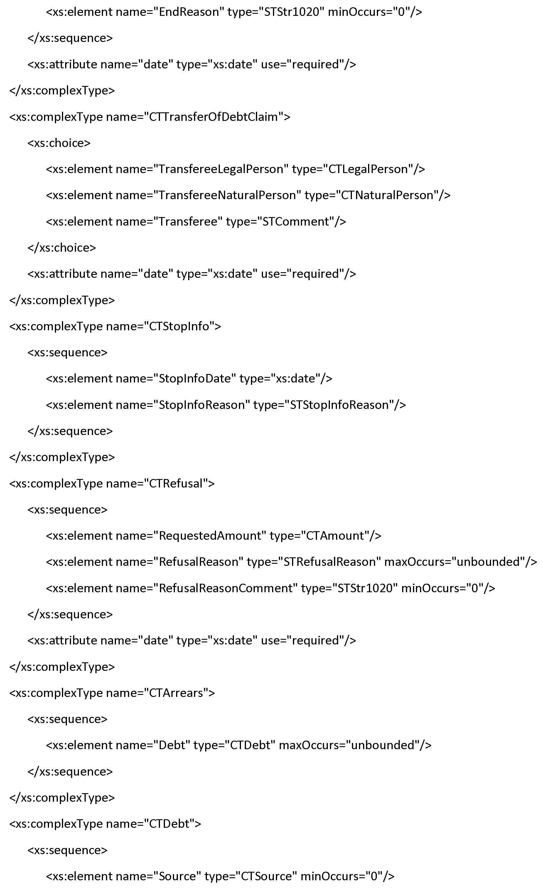 | Debt | Сведения о взыскании долга по алиментам, платы за жилое помещение, коммунальные услуги или услуги связи Элемент может повторяться при наличии информации о нескольких решениях суда или фактах взыскания денежных сумм. | Составной тип Таблица Ф.33 | Да |