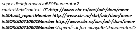 В файле XBRL факты показателя «Тип документа (выпадающий список)», имеющего код «nfo-dic:TipDokumenta_SpisokEnumerator2», в соответствии с примером представляются следующим образом: