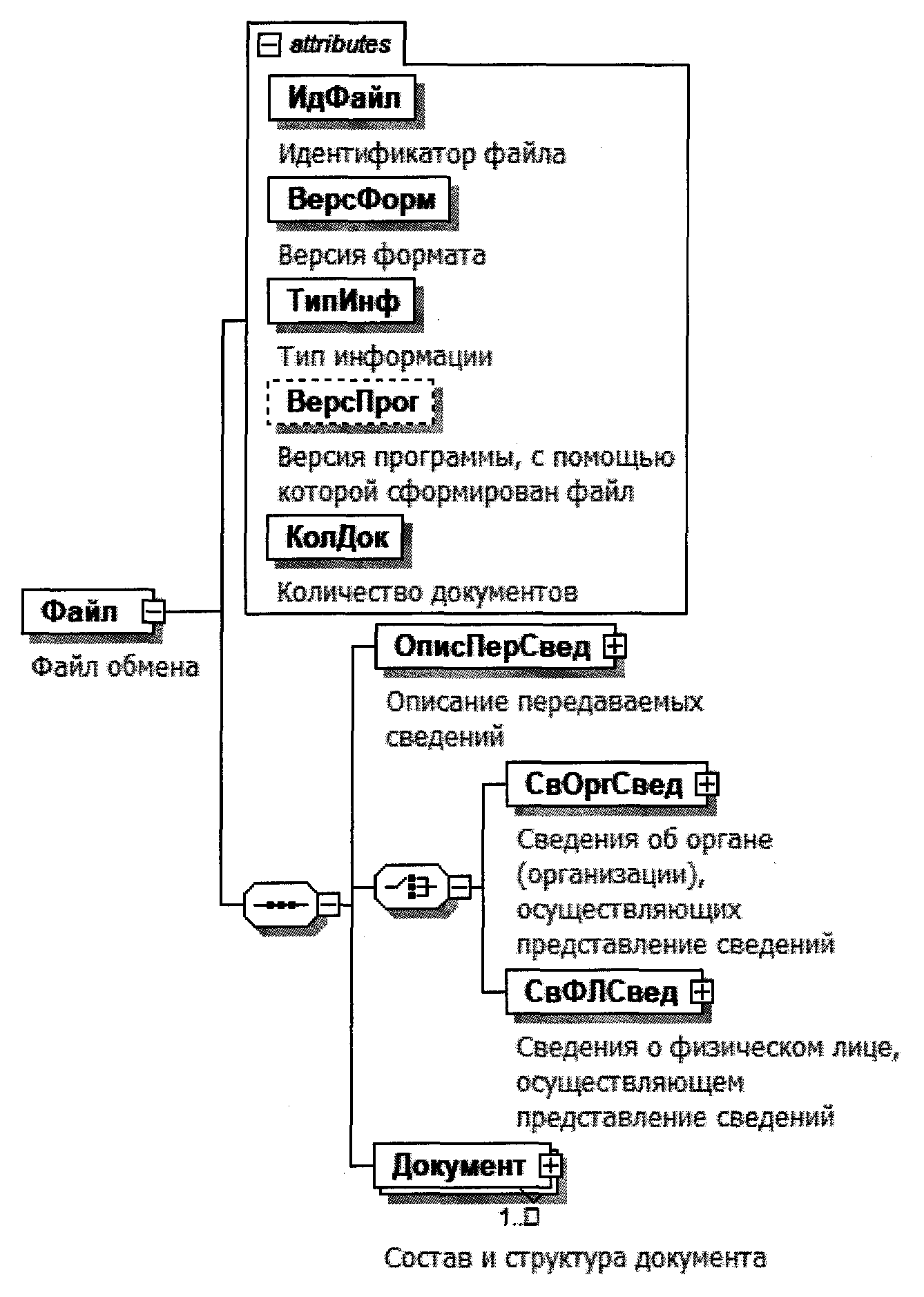 4. Логическая модель файла обмена представлена в виде диаграммы структуры файла обмена на рисунке 1 настоящего формата. Элементами логической модели файла обмена являются элементы и атрибуты XML-файла. Перечень структурных элементов логической модели файла обмена и сведения о них приведены в таблицах 4.1 - 4.7 настоящего формата.